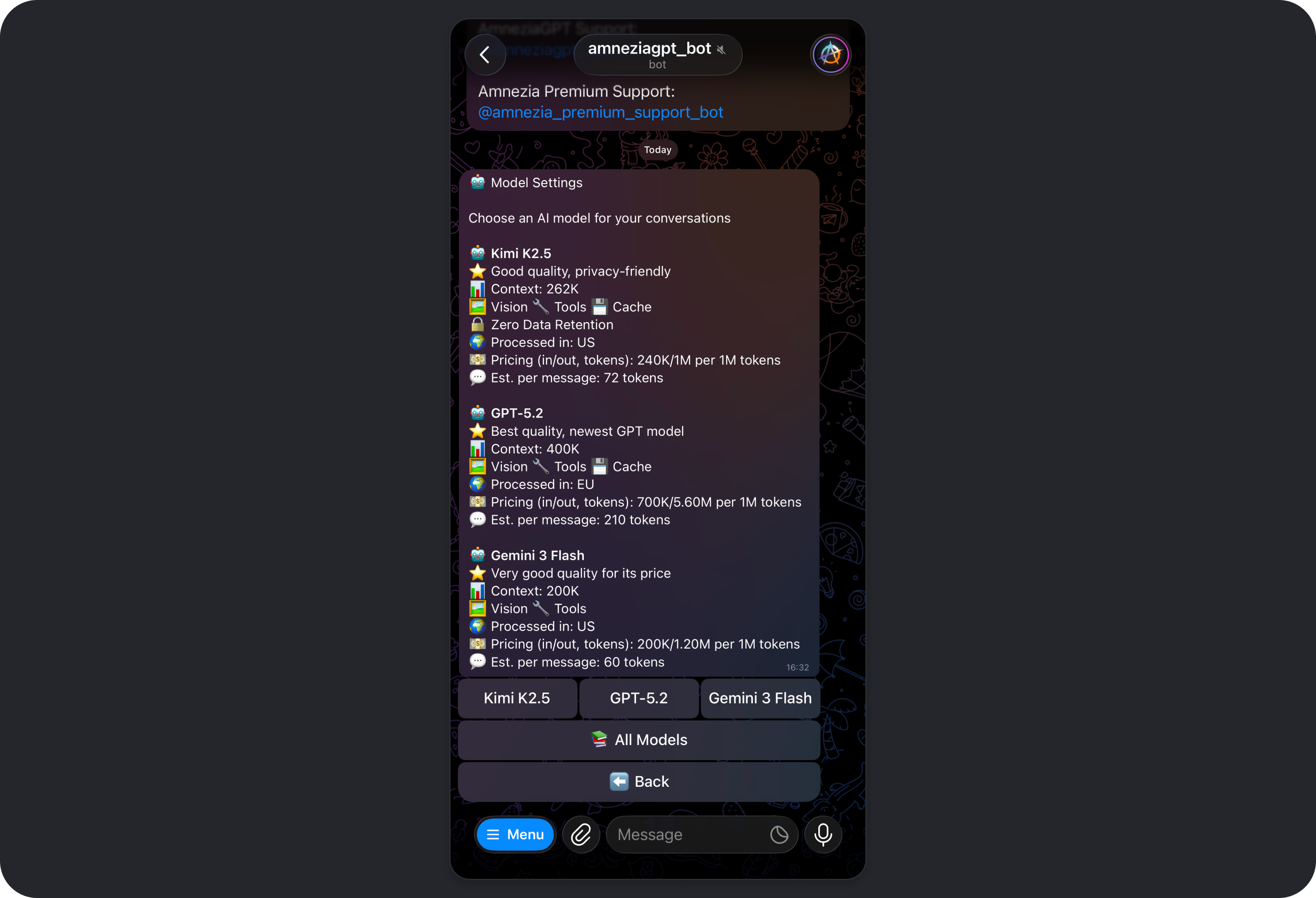 Amnezia GPT offers several AI models, including Gemini, GPT, and Kimi. All of them can: