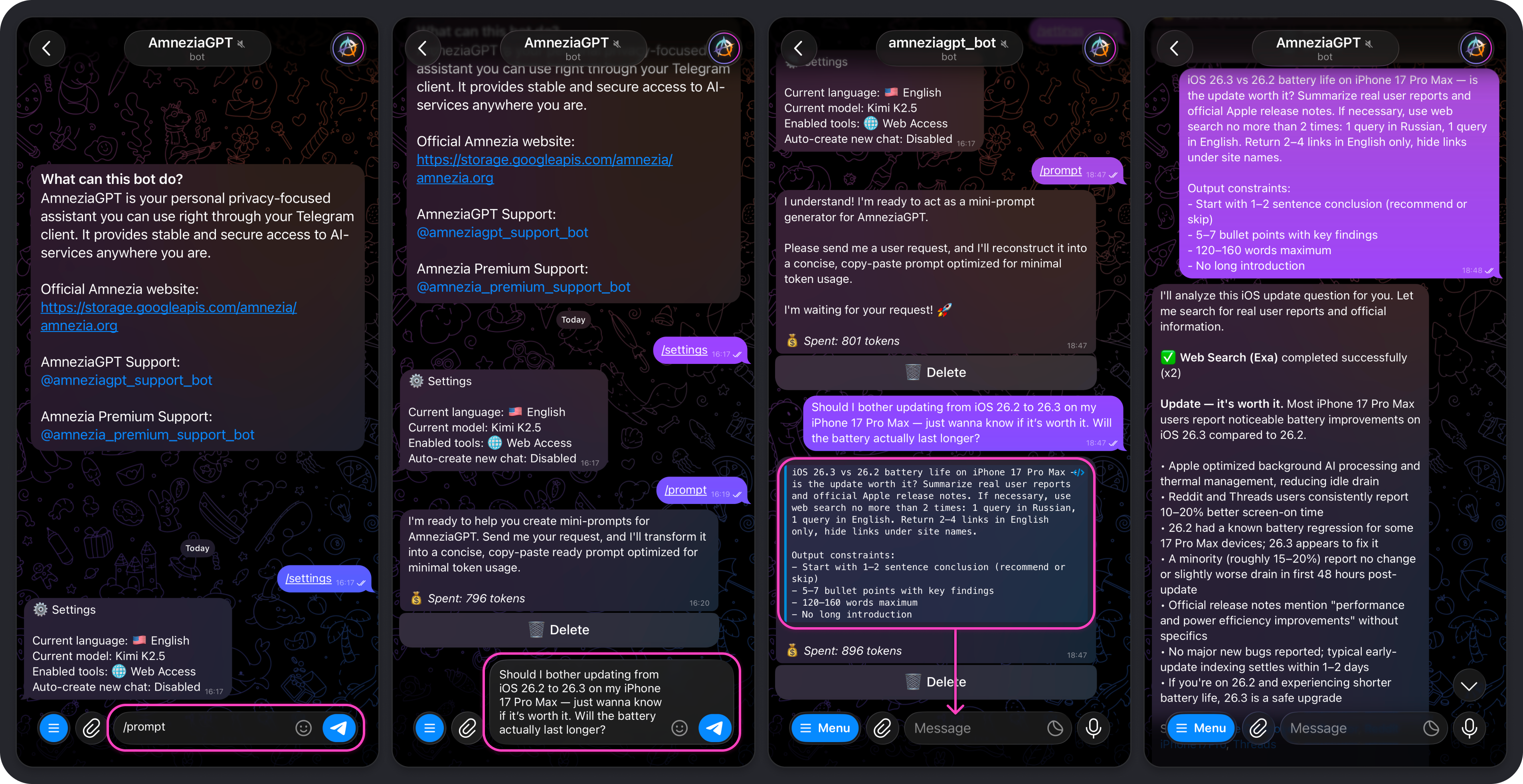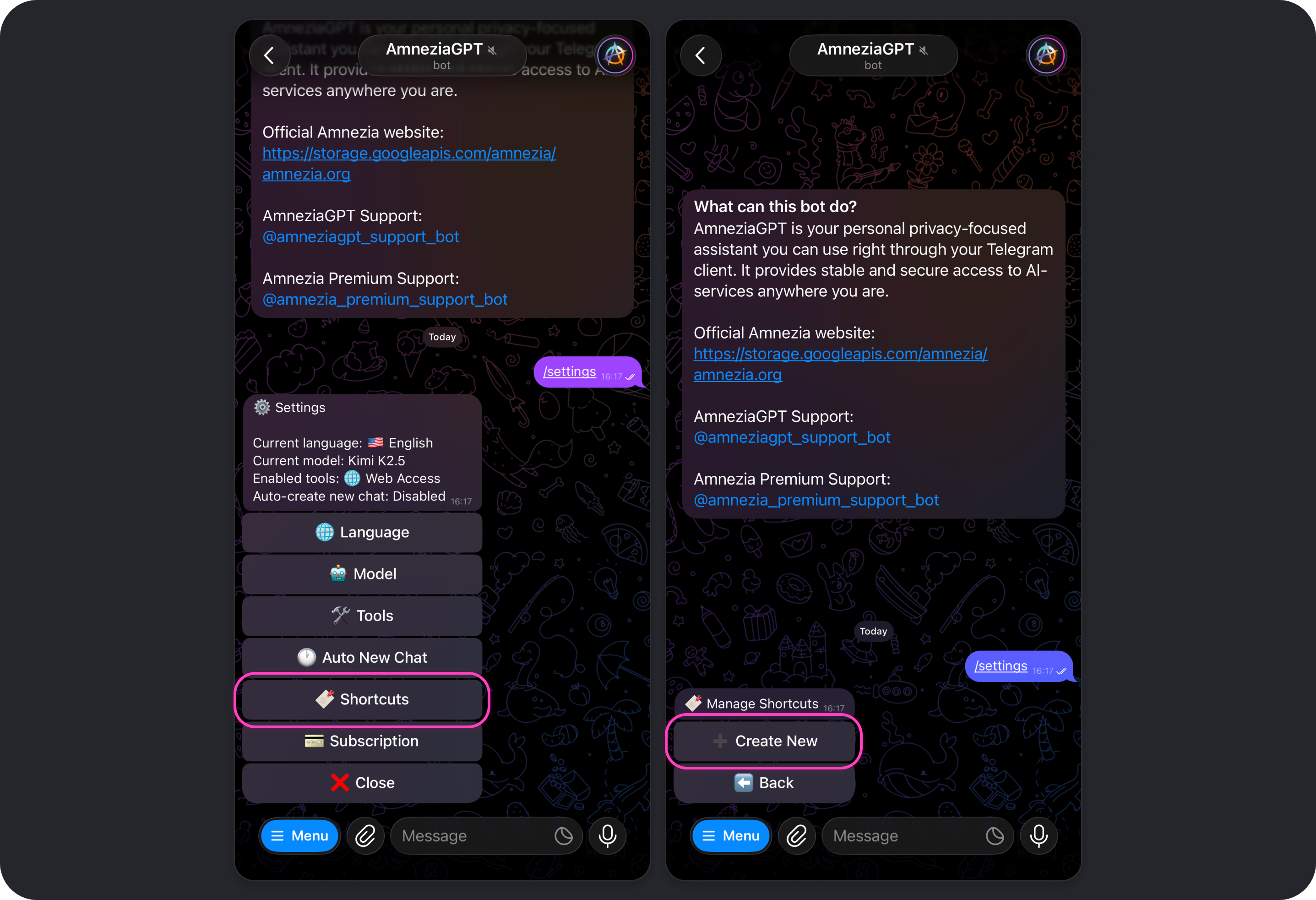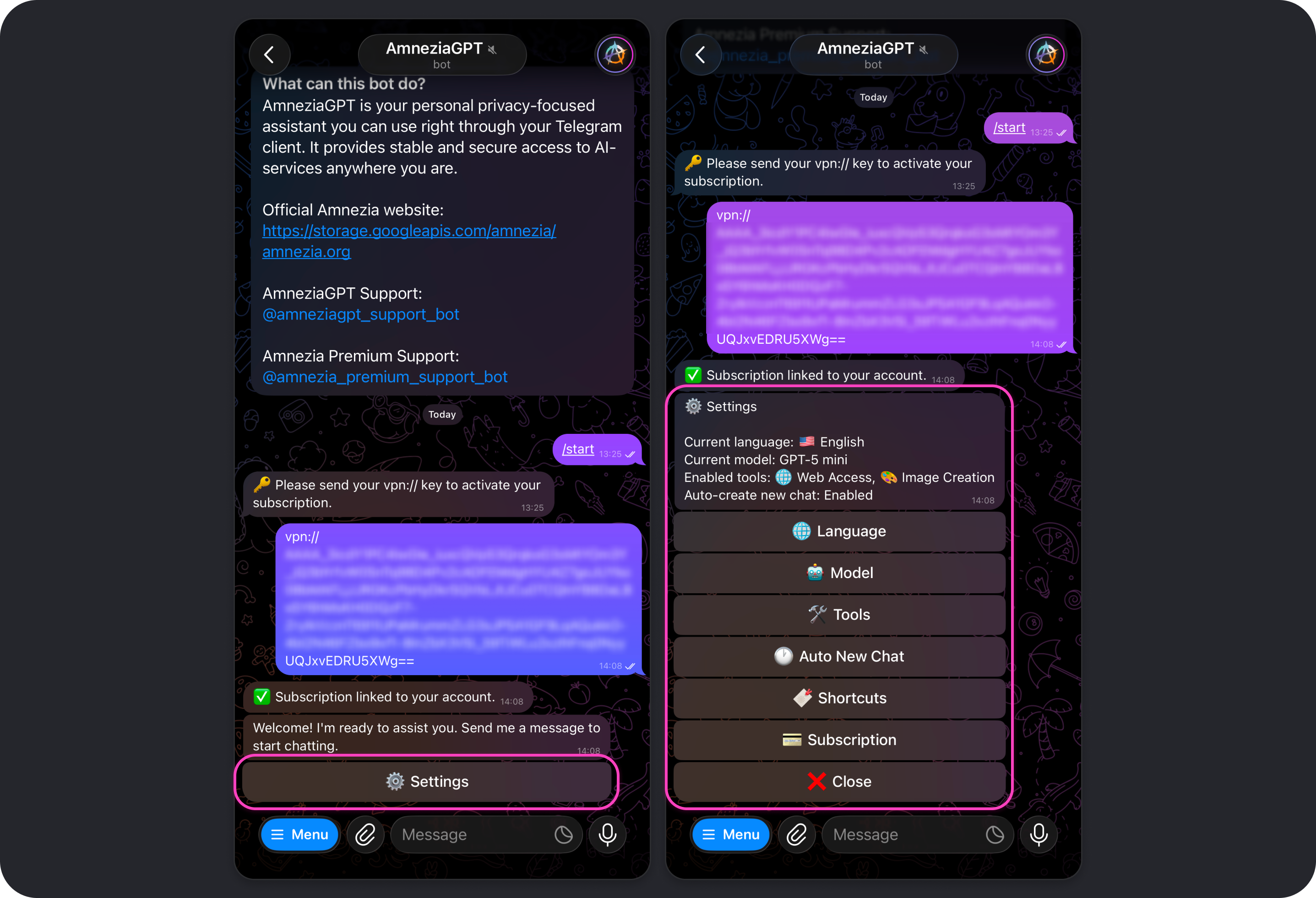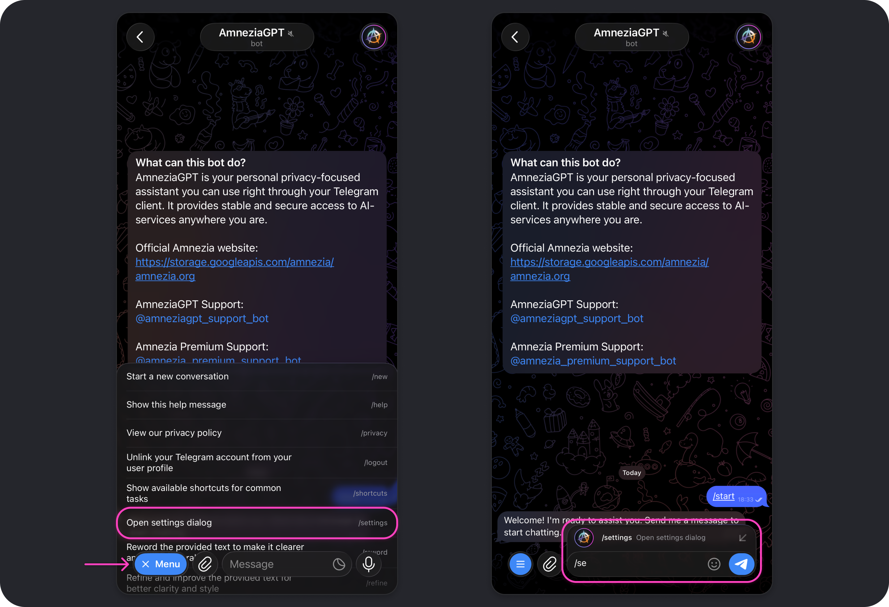 To open Amnezia GPT settings, tap Settings, send /settings in the bot chat, or choose that command from the command list that appears when you tap Menu.