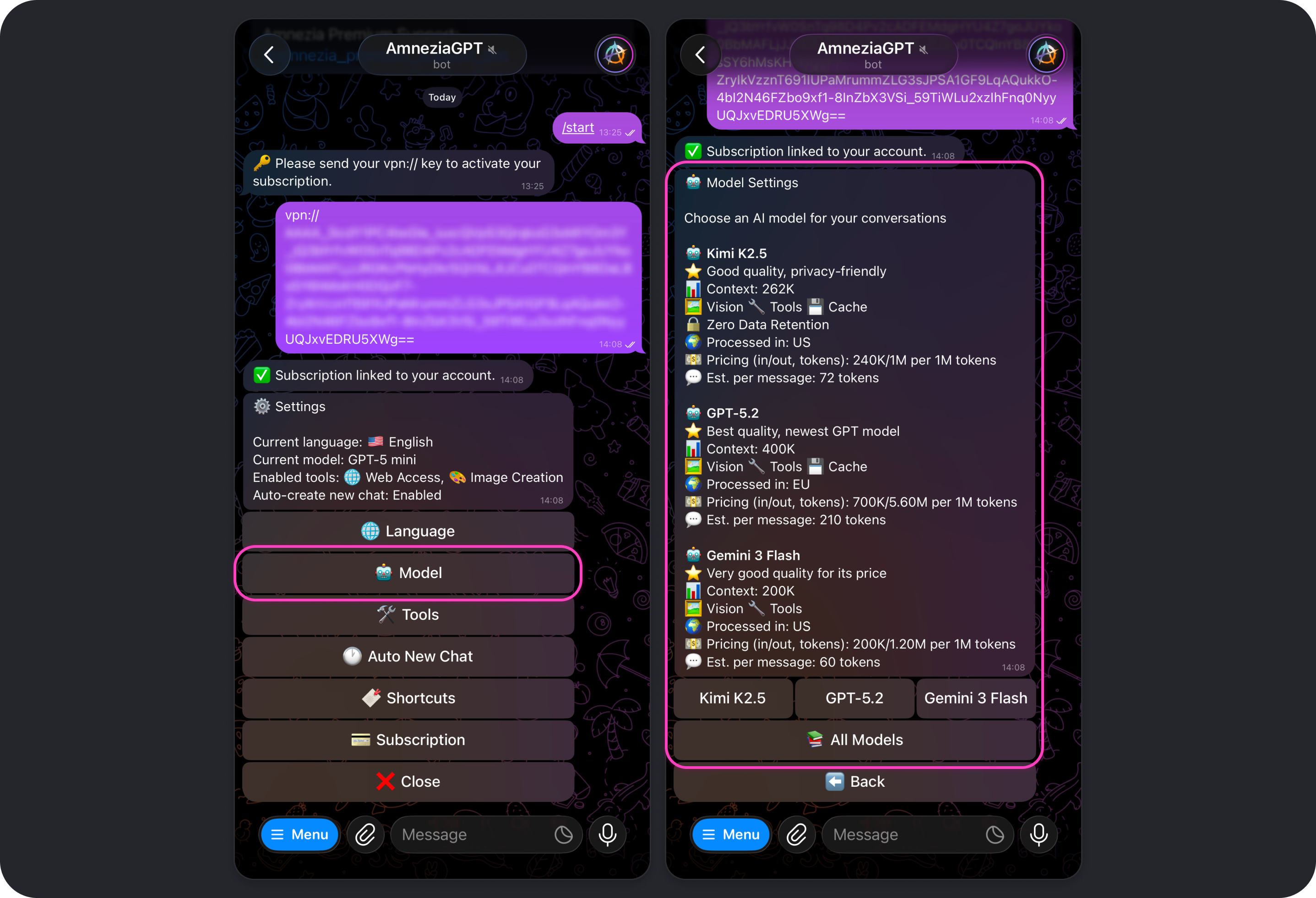 After that, you will see a confirmation message saying the subscription has been linked to your Telegram account. You can start sending requests right away, and the default model will answer them.