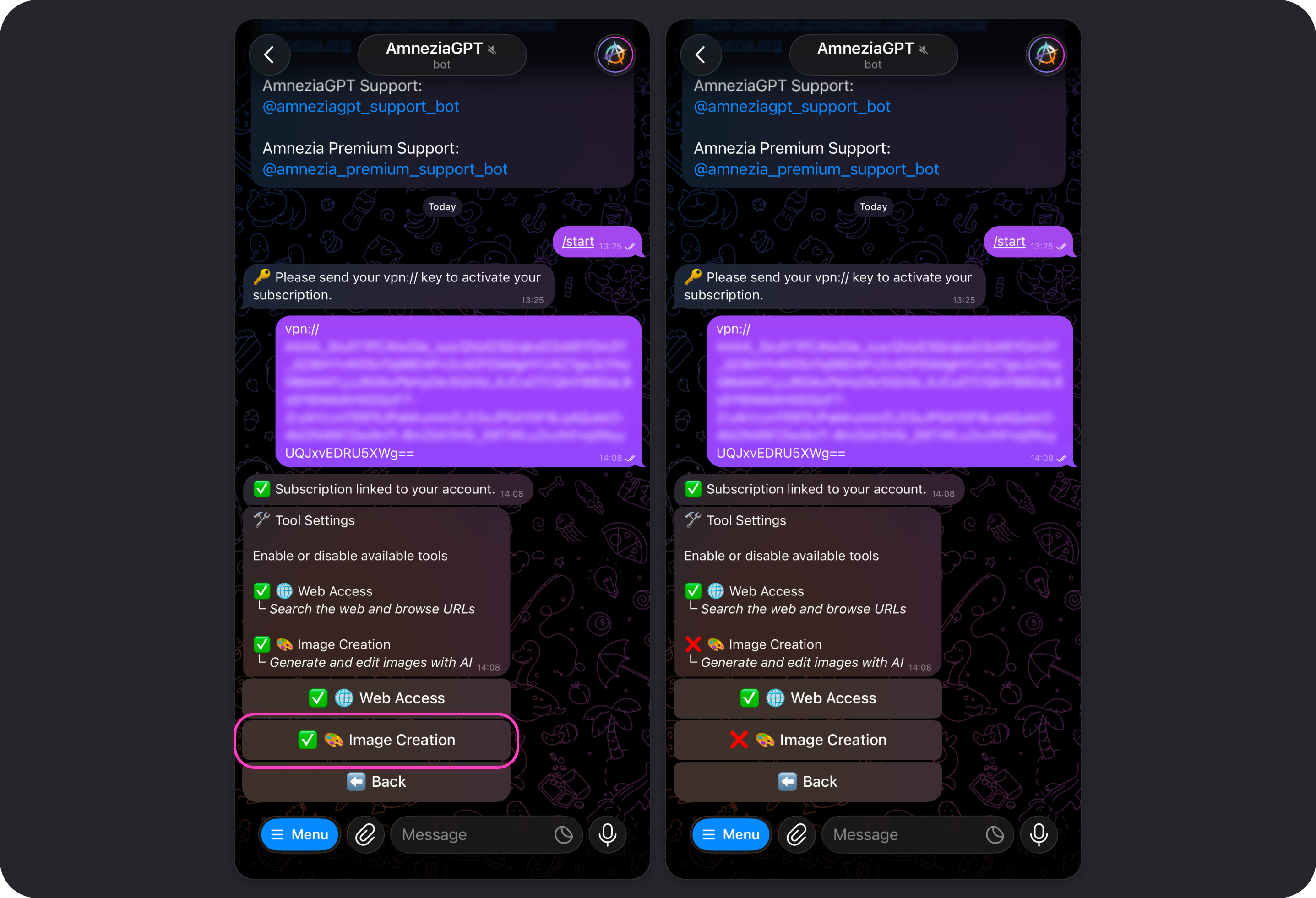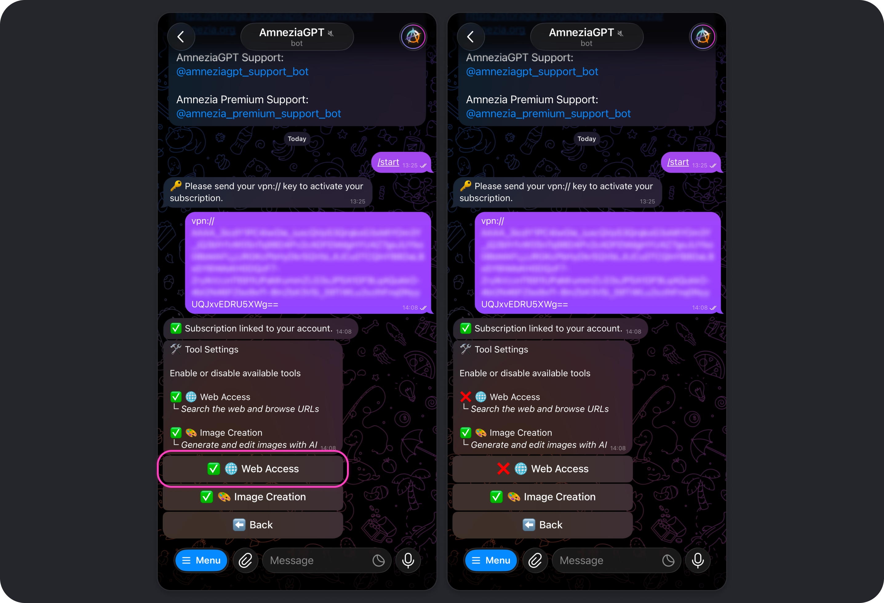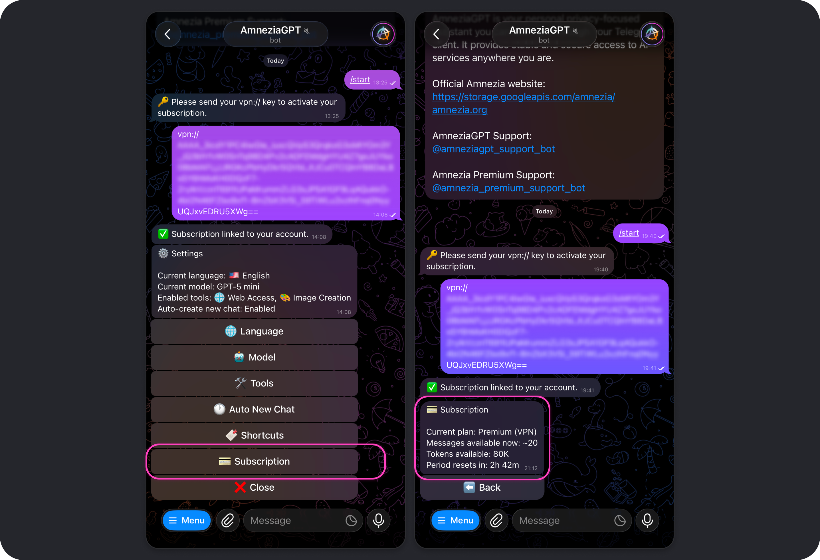 If needed, the same Amnezia Premium subscription key can be used with multiple Telegram accounts. That does not increase the available limit: the same shared pool of 80,000 tokens still refreshes 3 times a day, every 8 hours.