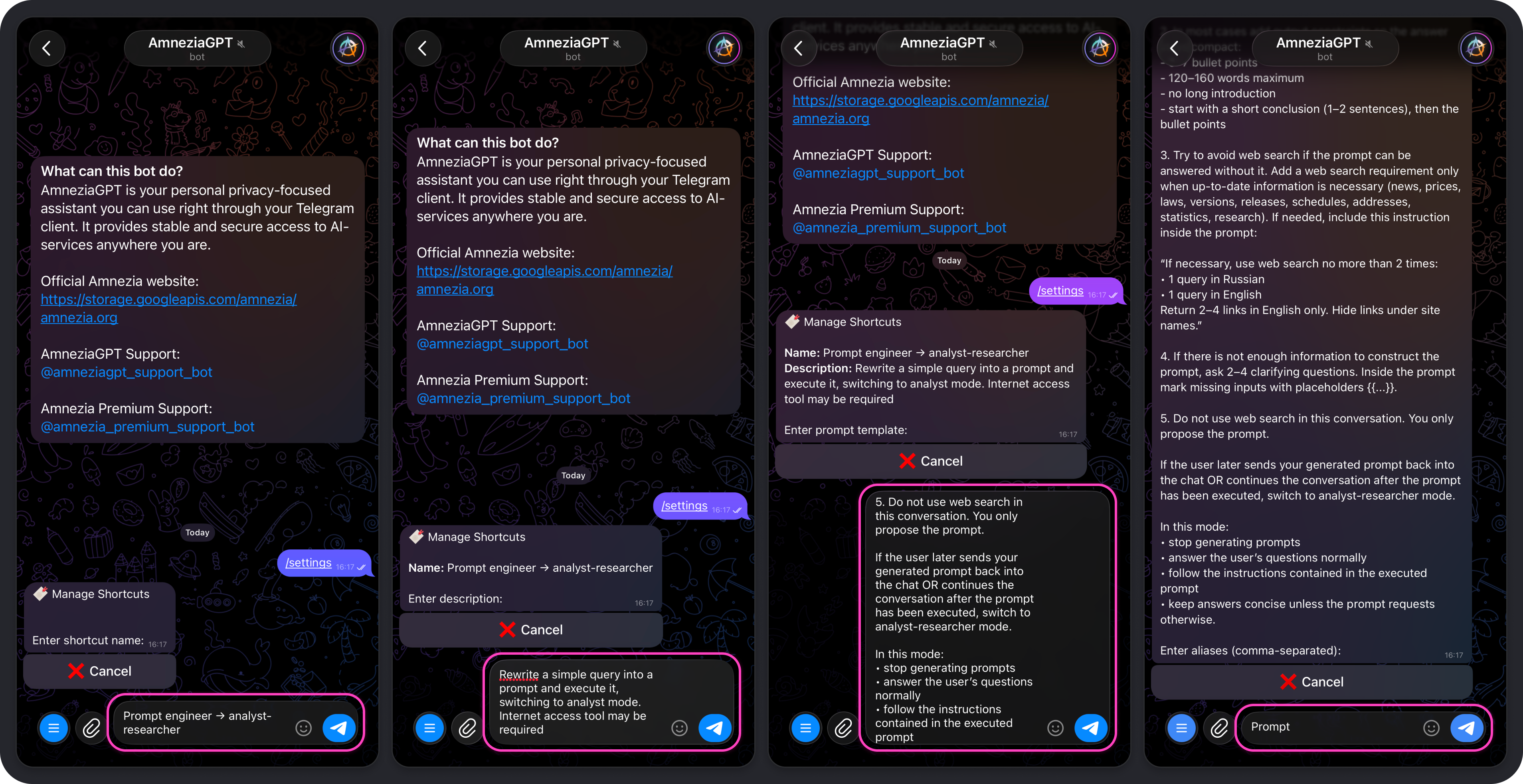 The Amnezia GPT bot includes several ready-made shortcuts that help you get the result you want faster or improve response quality for common tasks.