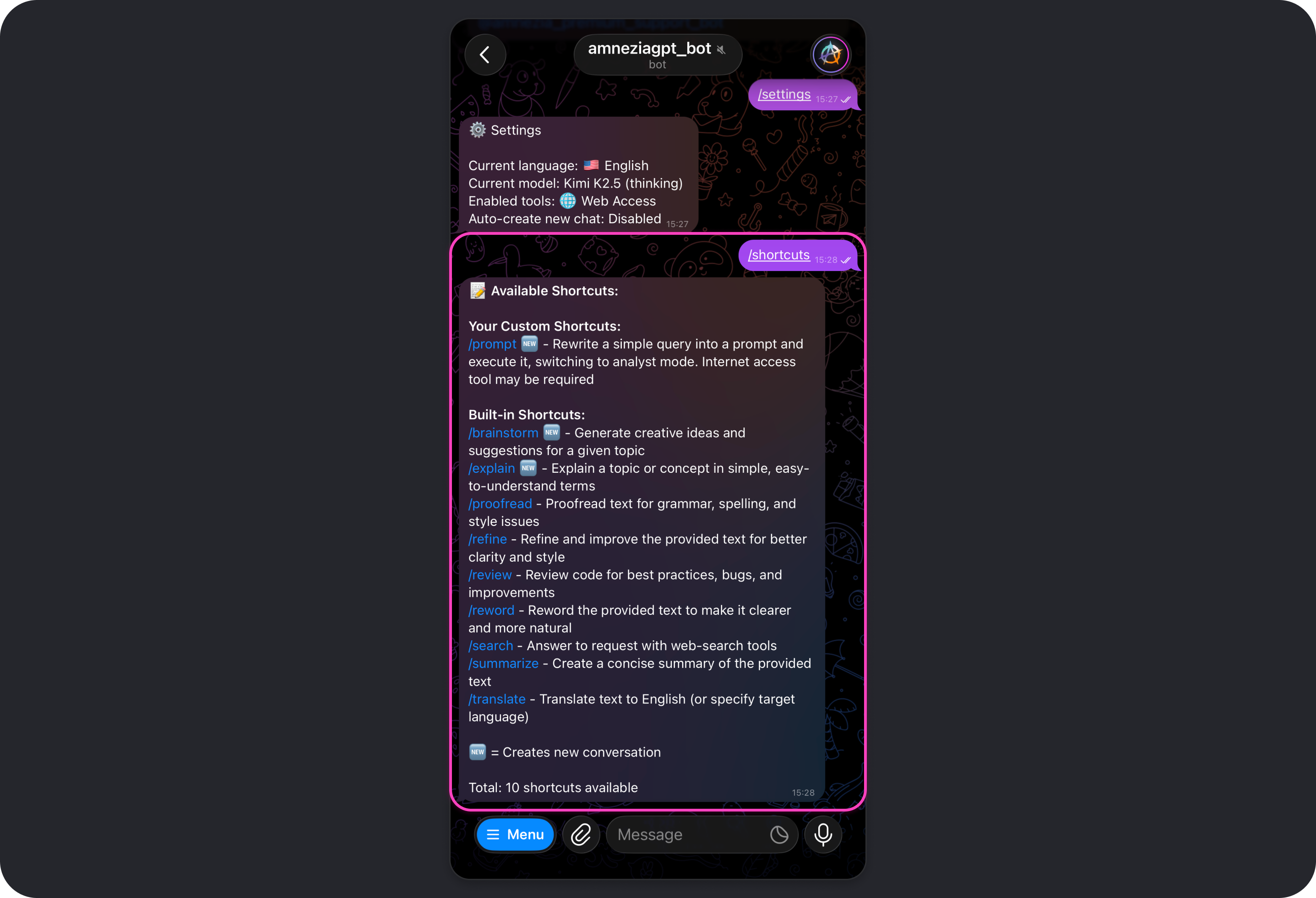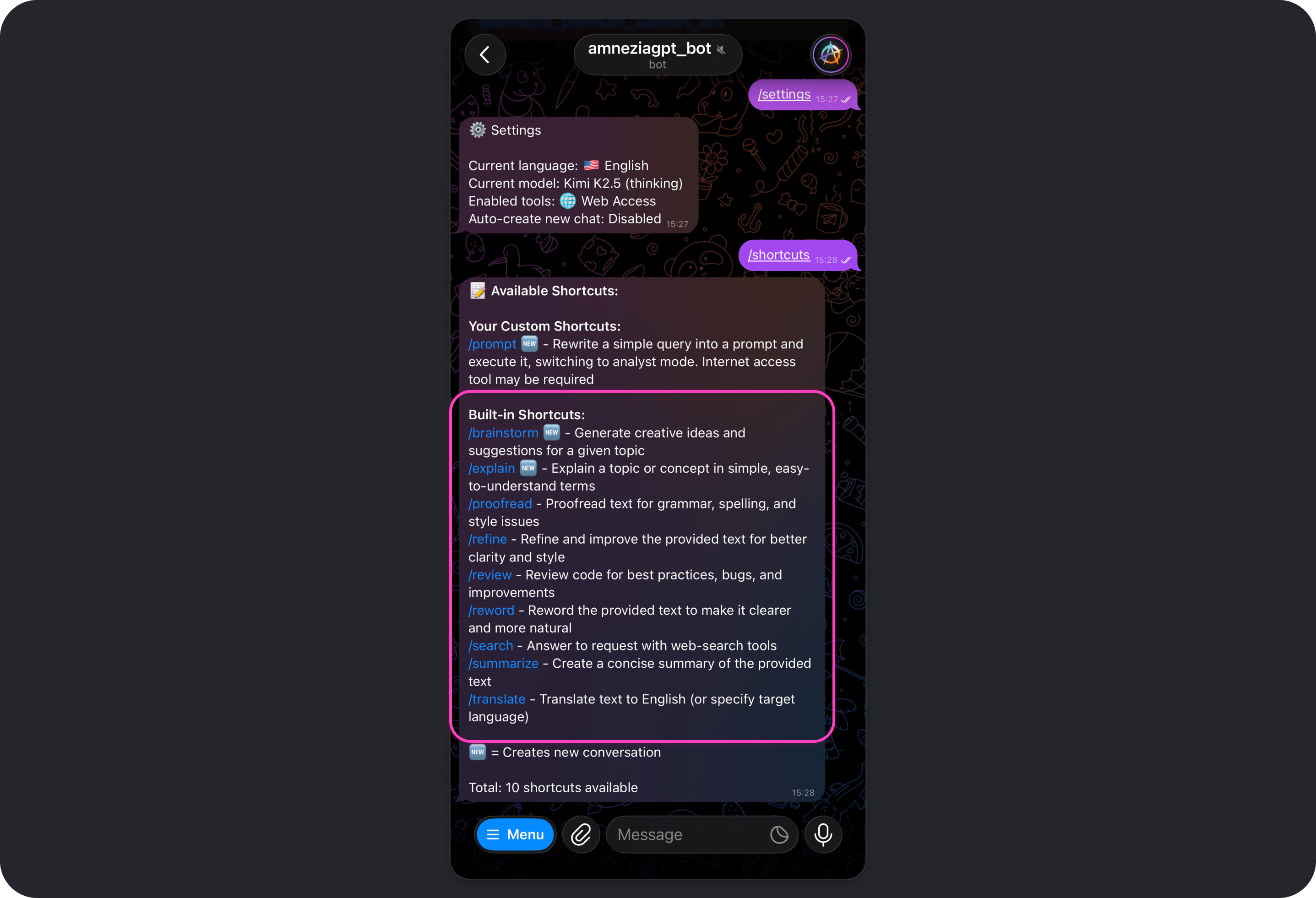 To see the full list of available shortcuts, including built-in and custom ones, send /shortcuts in the bot chat.