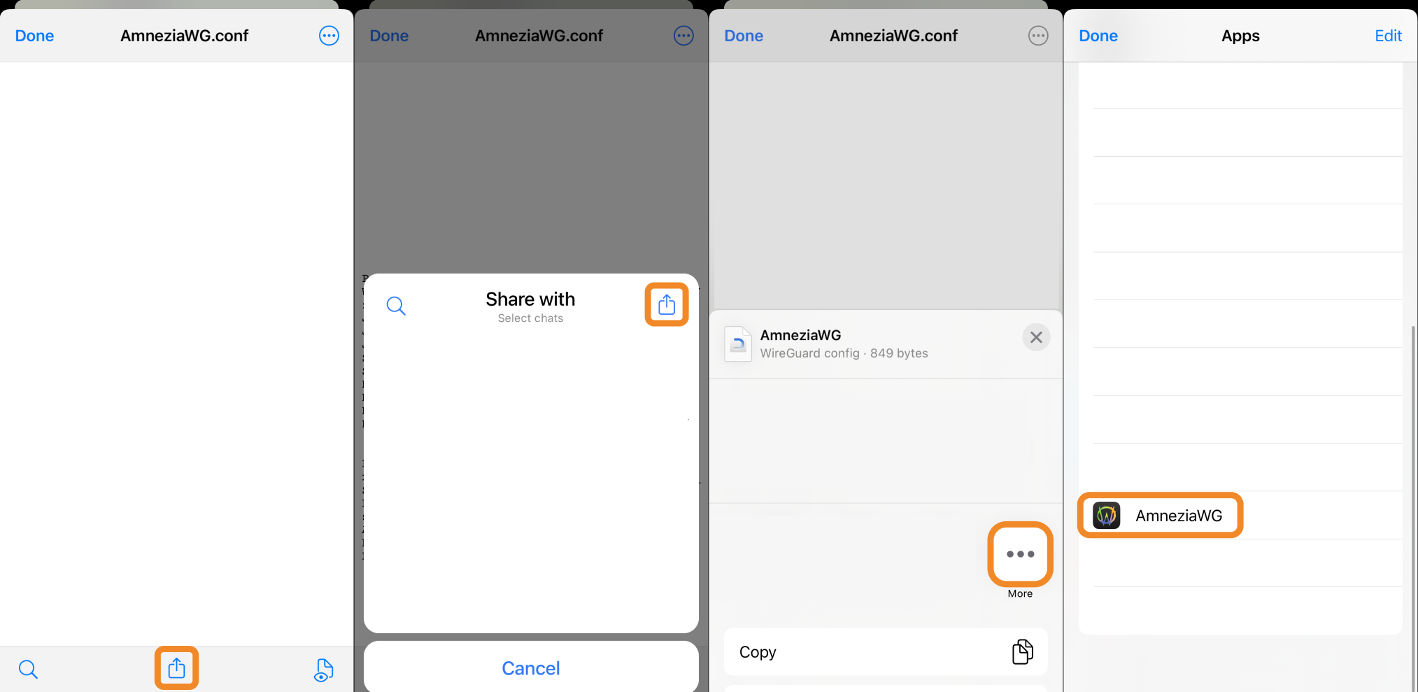 .conffile to your iOS device. - Open the received file and tap the Share icon, then tap Share again.
