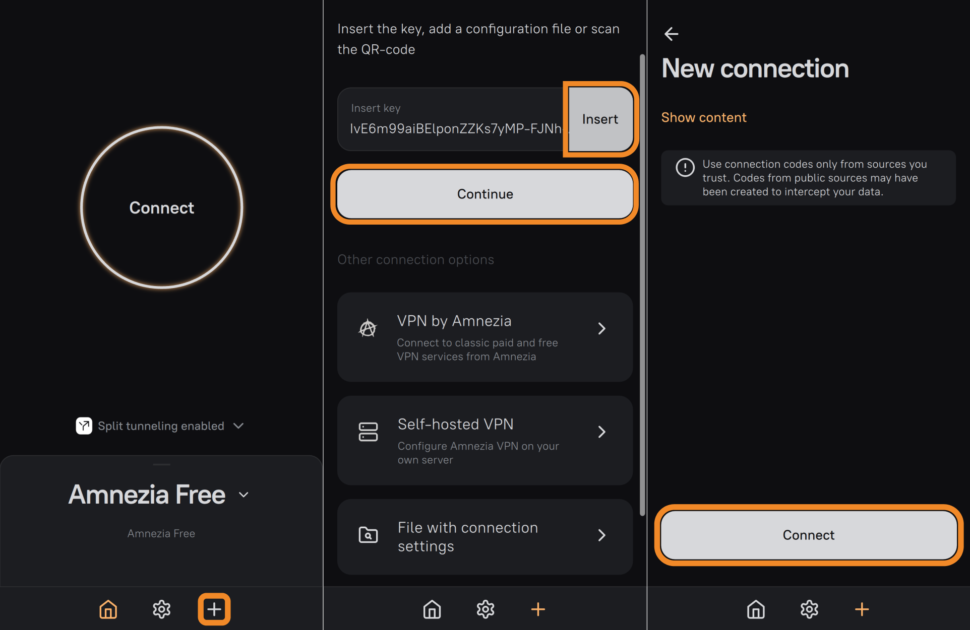 Tap Insert next to the key field → Continue → Connect.
