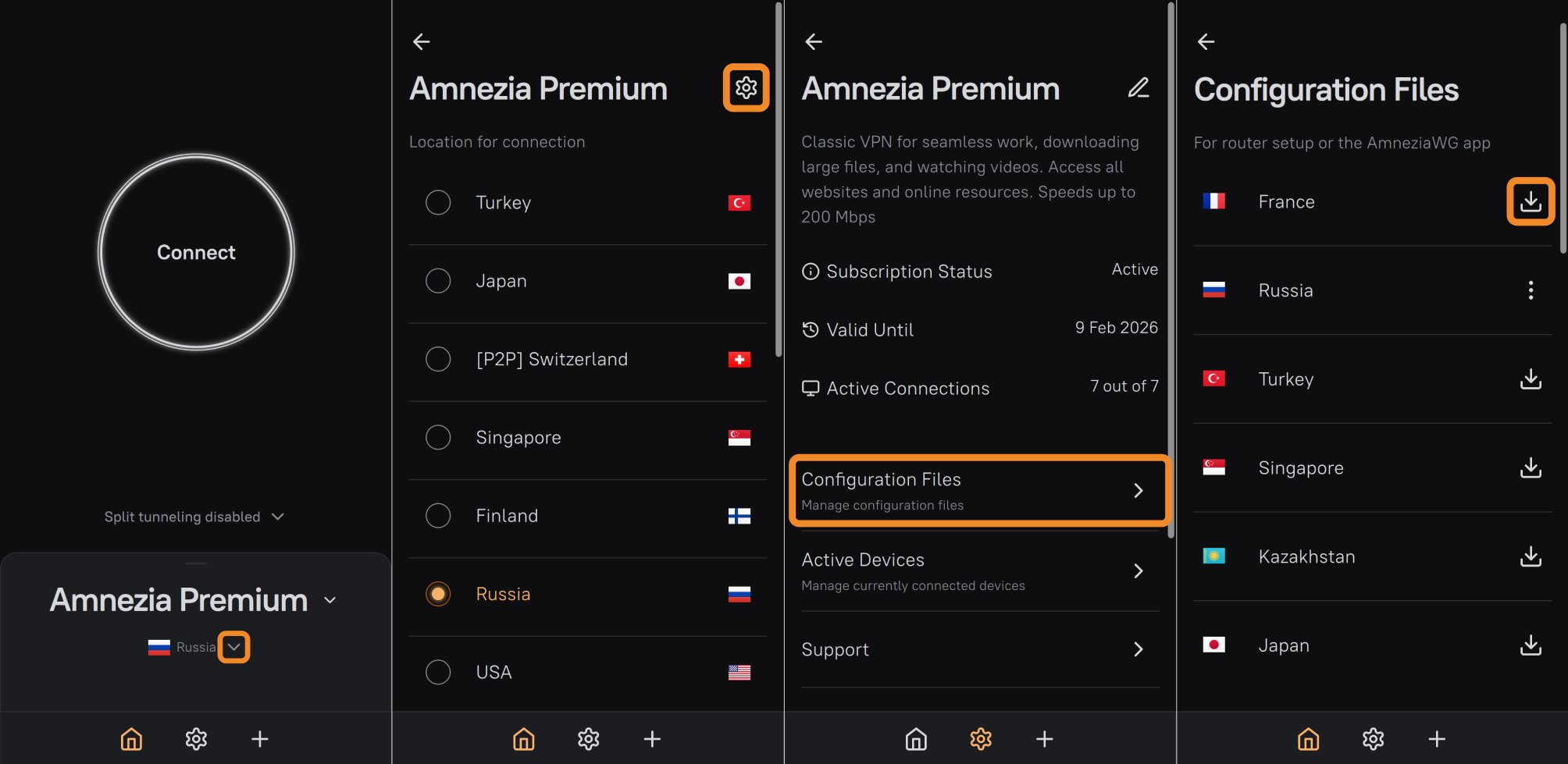 If you choose AmneziaWG, you can only use configuration files from your Personal Dashboard to create a connection — the Subscription Key vpn:// won't work there. When you generate a configuration file, it uses 1 active-connection slot (max 7).