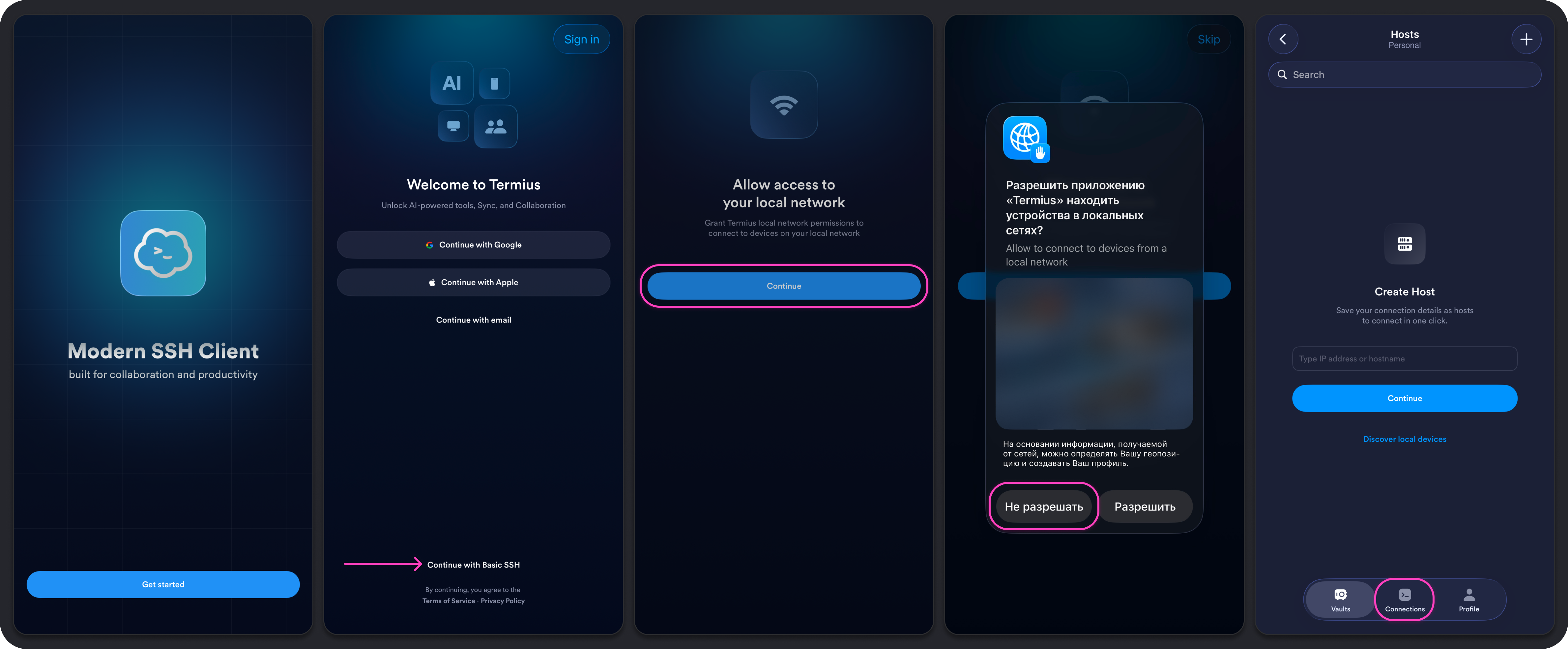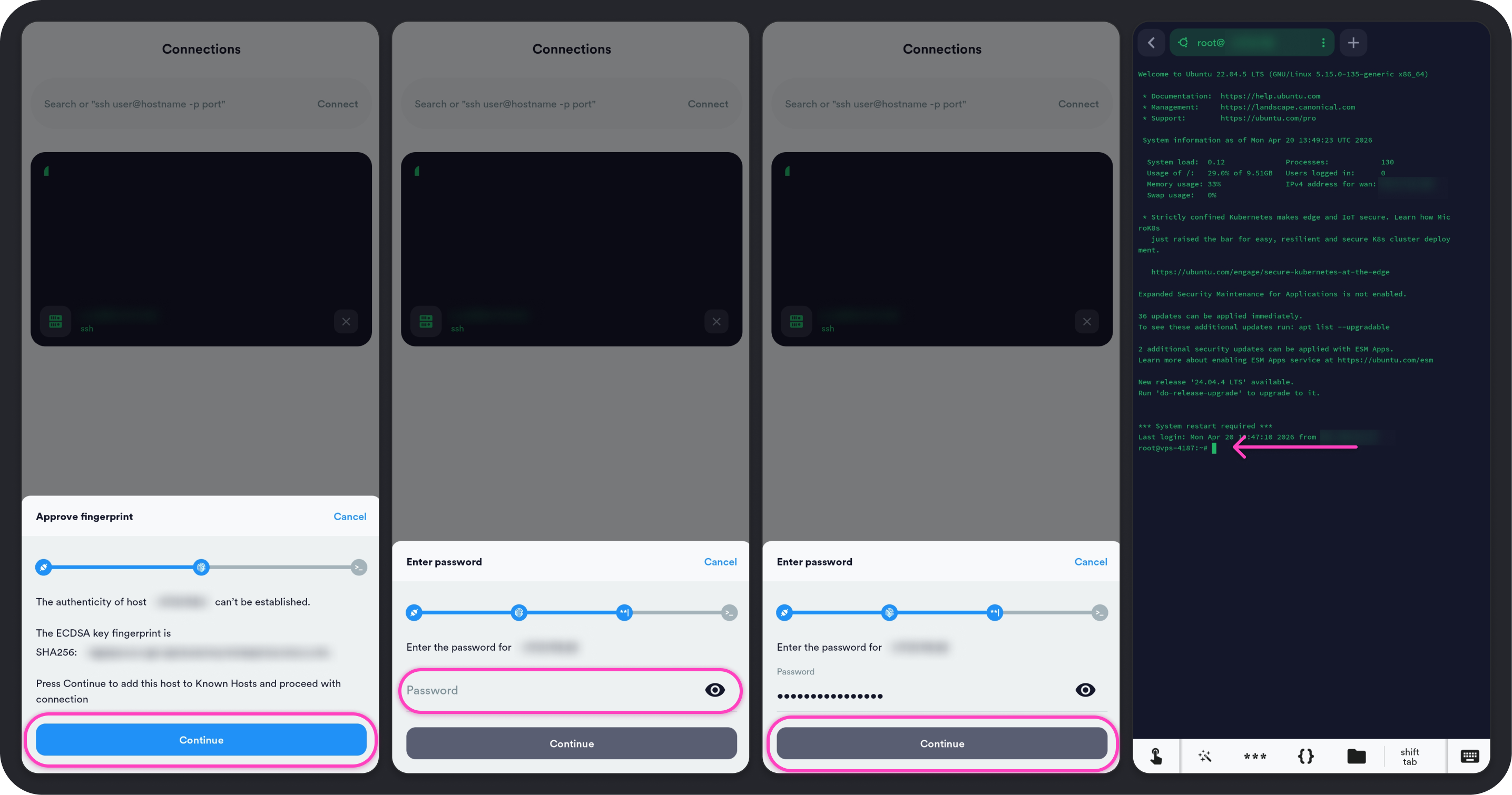 При первом подключении по SSH с устройства сервер попросит подтвердить fingerprint. Введите