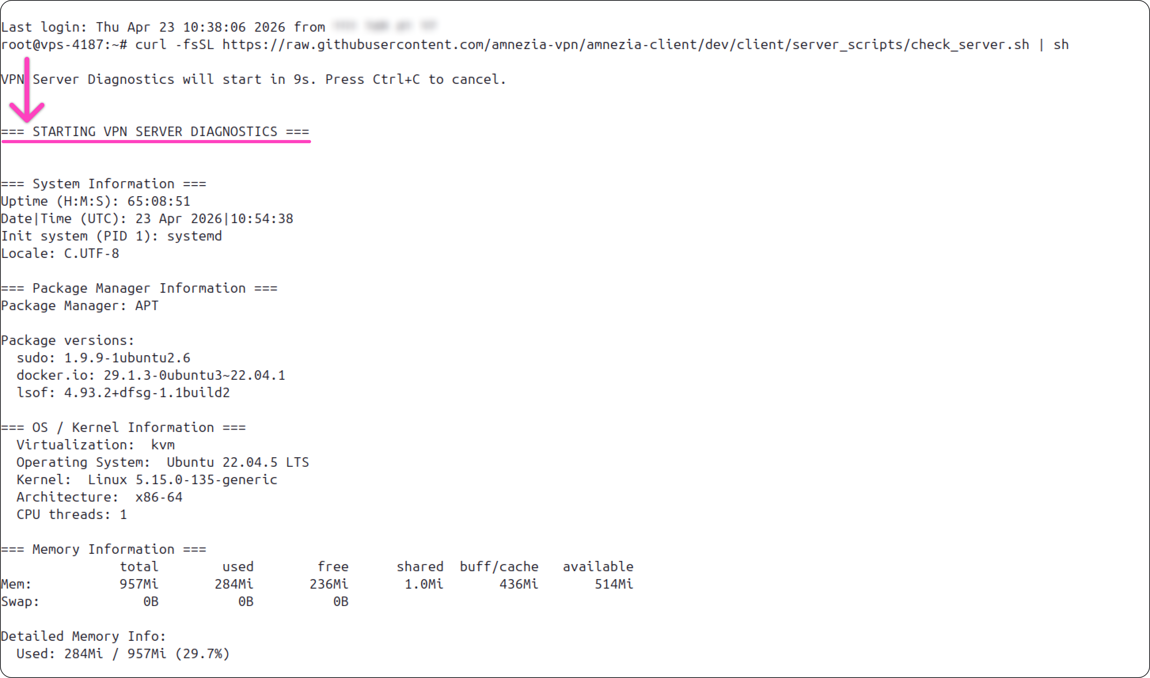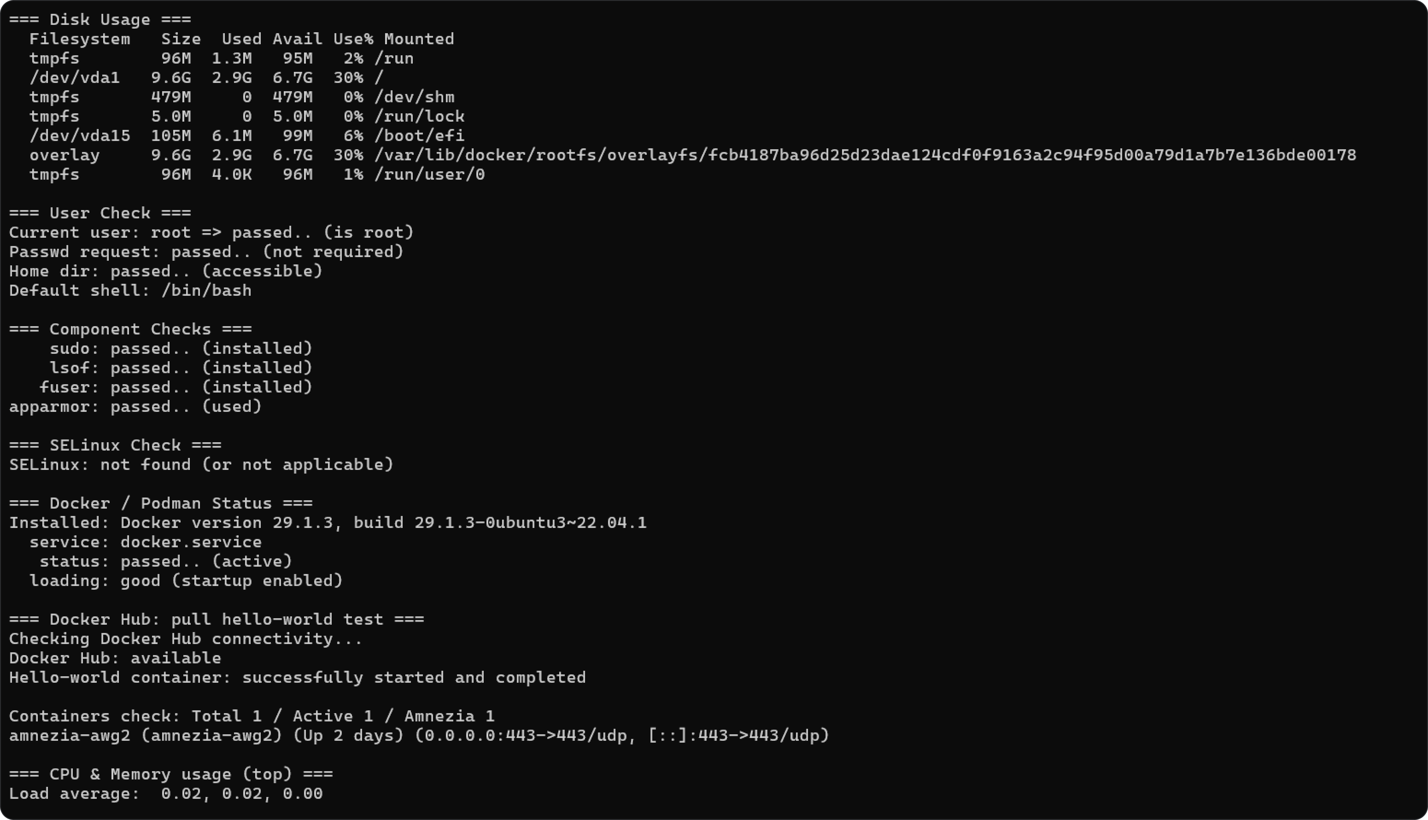 wget -qO- https://raw.githubusercontent.com/amnezia-vpn/amnezia-client/dev/client/server_scripts/check_server.sh | sh