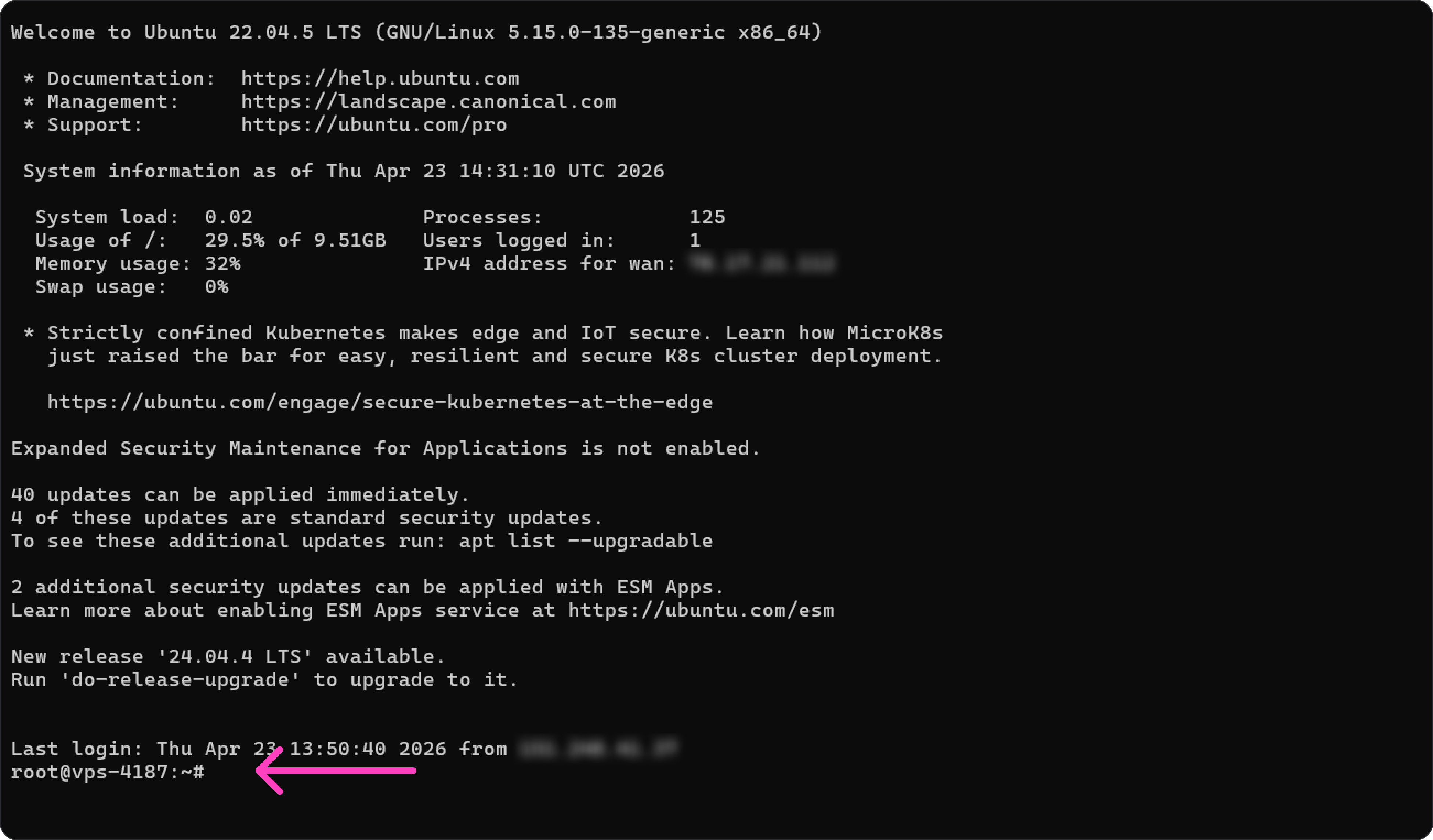 После успешного подключения откроется SSH-сессия. В примере ниже видно краткую информацию о сервере: операционную систему, использование диска и памяти, доступные обновления и т. д. В самом н изу появится командная строка — отсюда мы можем управлять сервером с помощью команд.