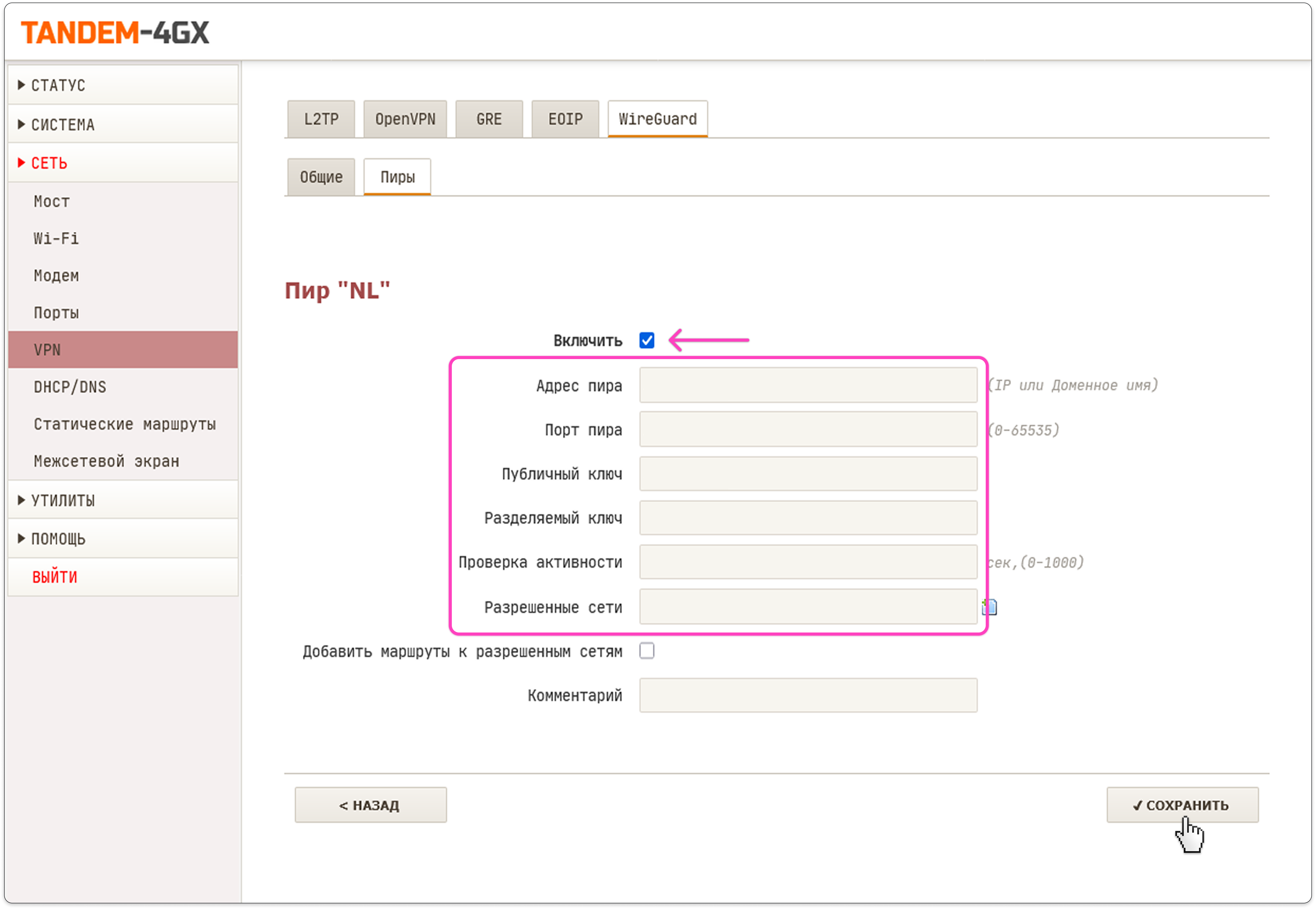 - Адрес и порт пира — заполните значением параметра Endpoint из файла конфигурации