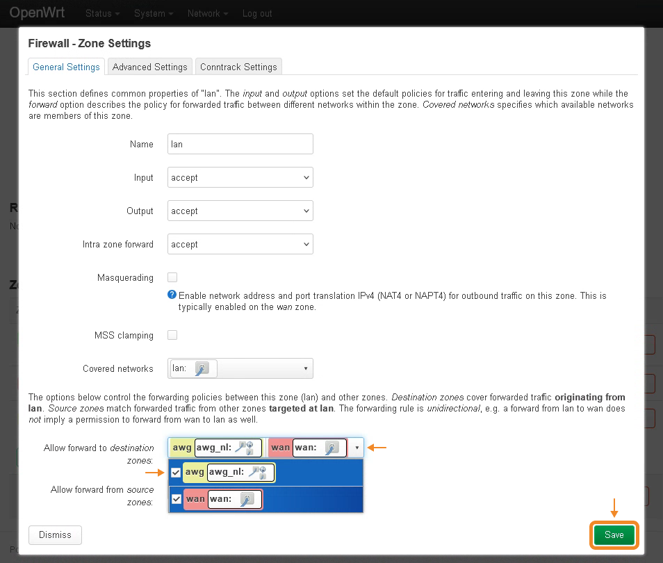 - Click the Allow forward to destination zones drop-down list → check the box next to your previously created firewall zone → click Save.
