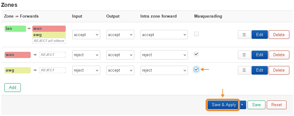 - Check the Masquerading option for your previously created firewall zone → click Save & Apply.