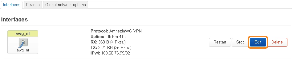 - Click Edit to the right of the created VPN interface.