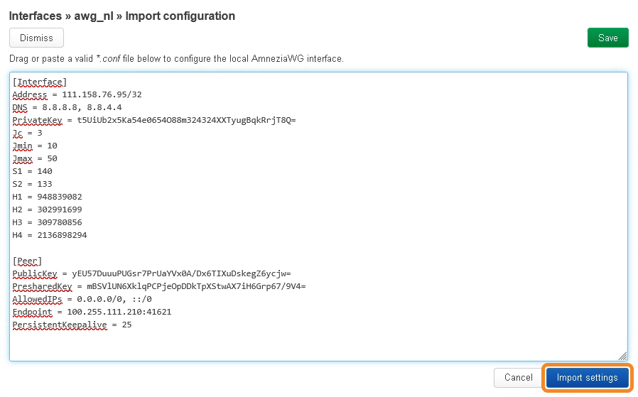 - Either paste the entire contents of your configuration file or drag and drop the configuration file into the window → click Import settings.