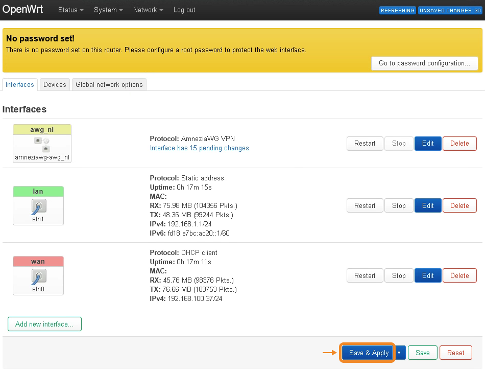 - In the window that appears, while on the Interfaces tab, click Save & Apply → go to System in the top-menu → Reboot.