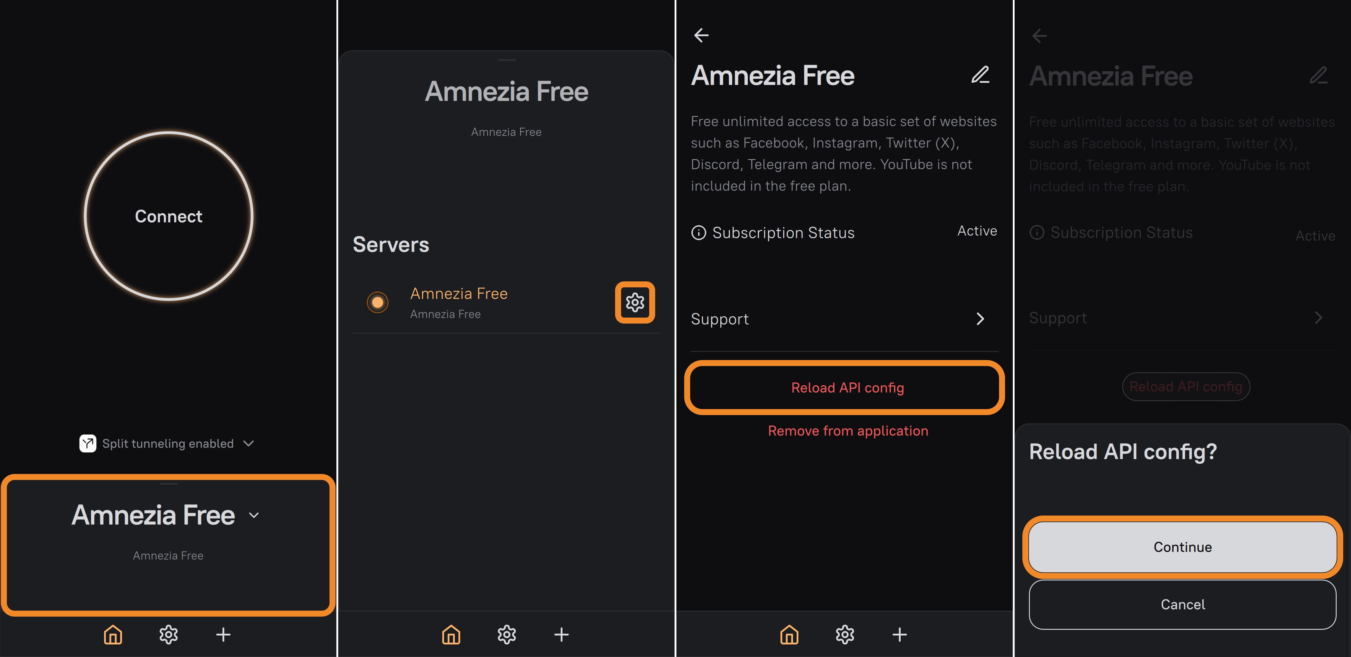 - Tap the ⚙️ (gear) icon to the right of the Amnezia Free connection name.
