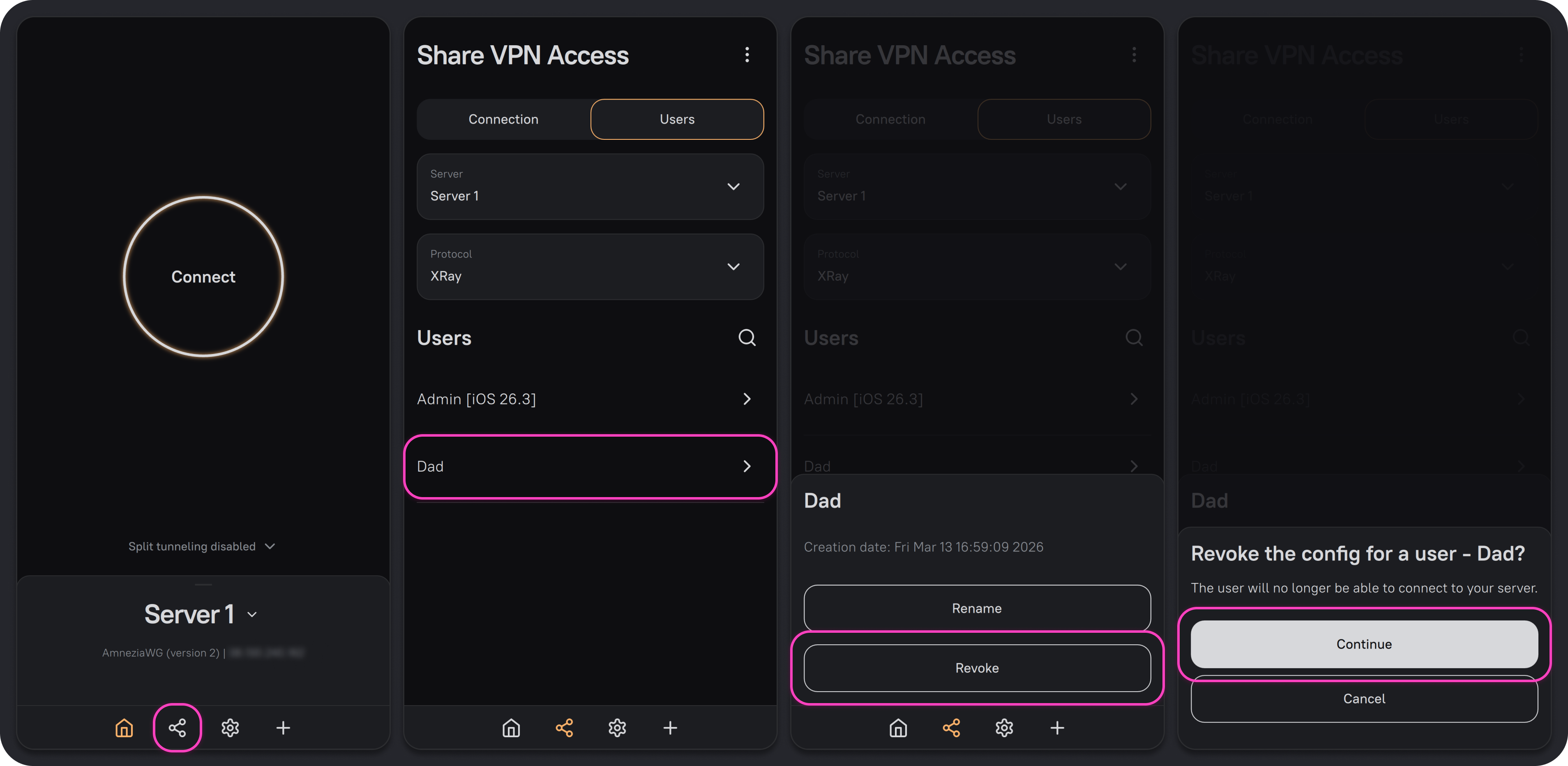 - Open the AmneziaVPN app with an existing full access connection to the server, then click the Share icon on the bottom bar to the left of the gear icon.