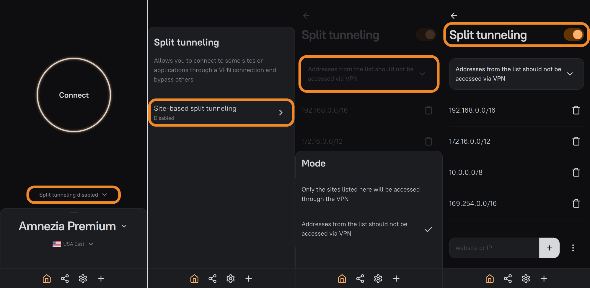 - Android — split tunneling can be configured both by IP addresses and by apps. For each type there are two modes: selected IPs/apps work through VPN or without VPN.