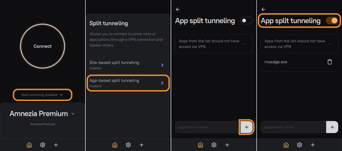 In Windows, AmneziaVPN supports a single app split mode in which only apps from your list work without VPN. The opposite mode — "only apps from the list work through VPN" — is available in AmneziaVPN on Android and is not available on Windows.