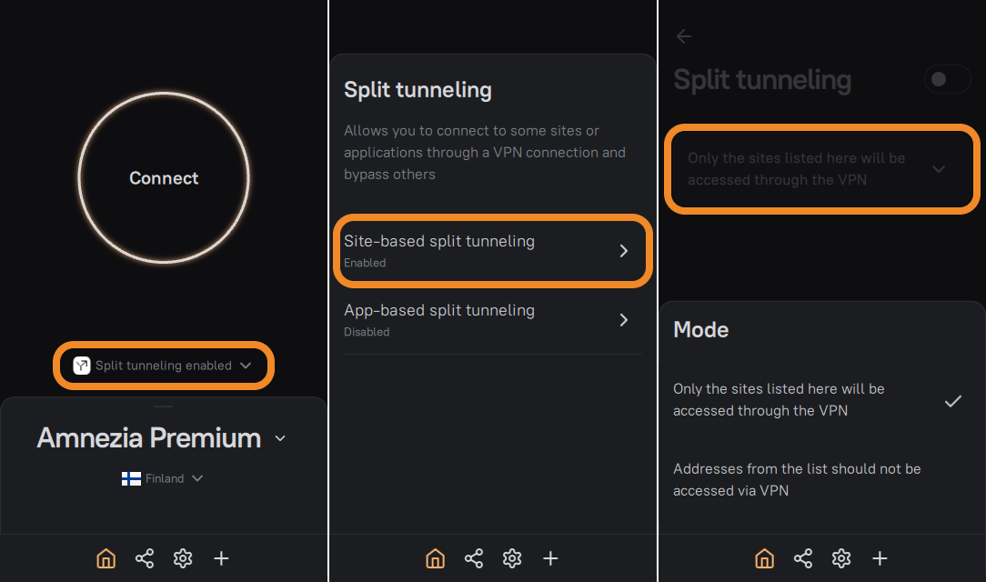 - Open split tunneling settings for sites (IPs) in AmneziaVPN and select Only the sites listed here will be accessed through the VPN.