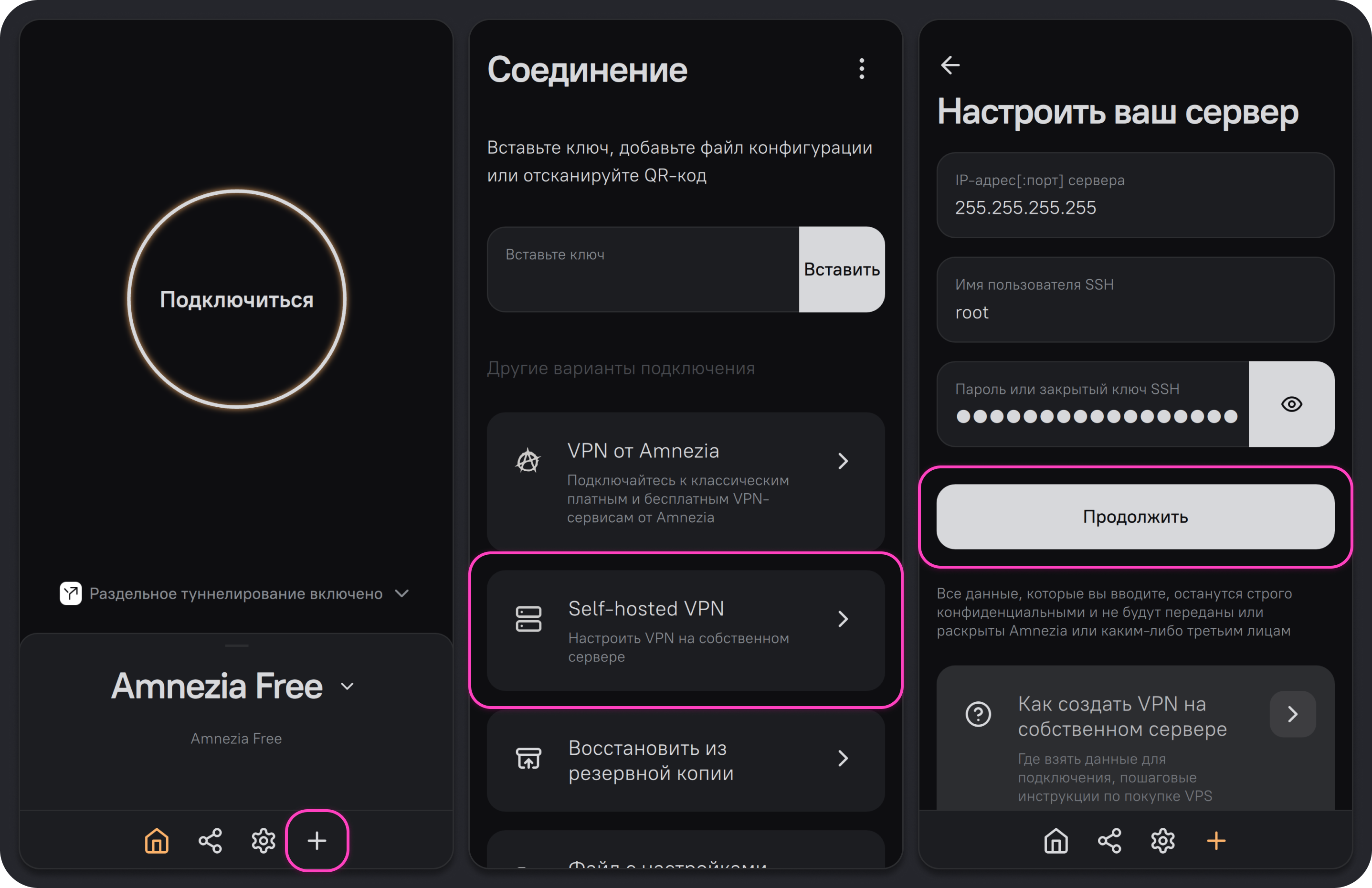 В этой инструкции описаны все шаги по подключению к серверу Amnezia Hosting и настройке на нём VPN с помощью приложения AmneziaVPN. Подключаться к серверу по SSH и вносить какие-либо изменения в настройки или параметры сервера не требуется, если сервер будет использоваться только для VPN-подключения.