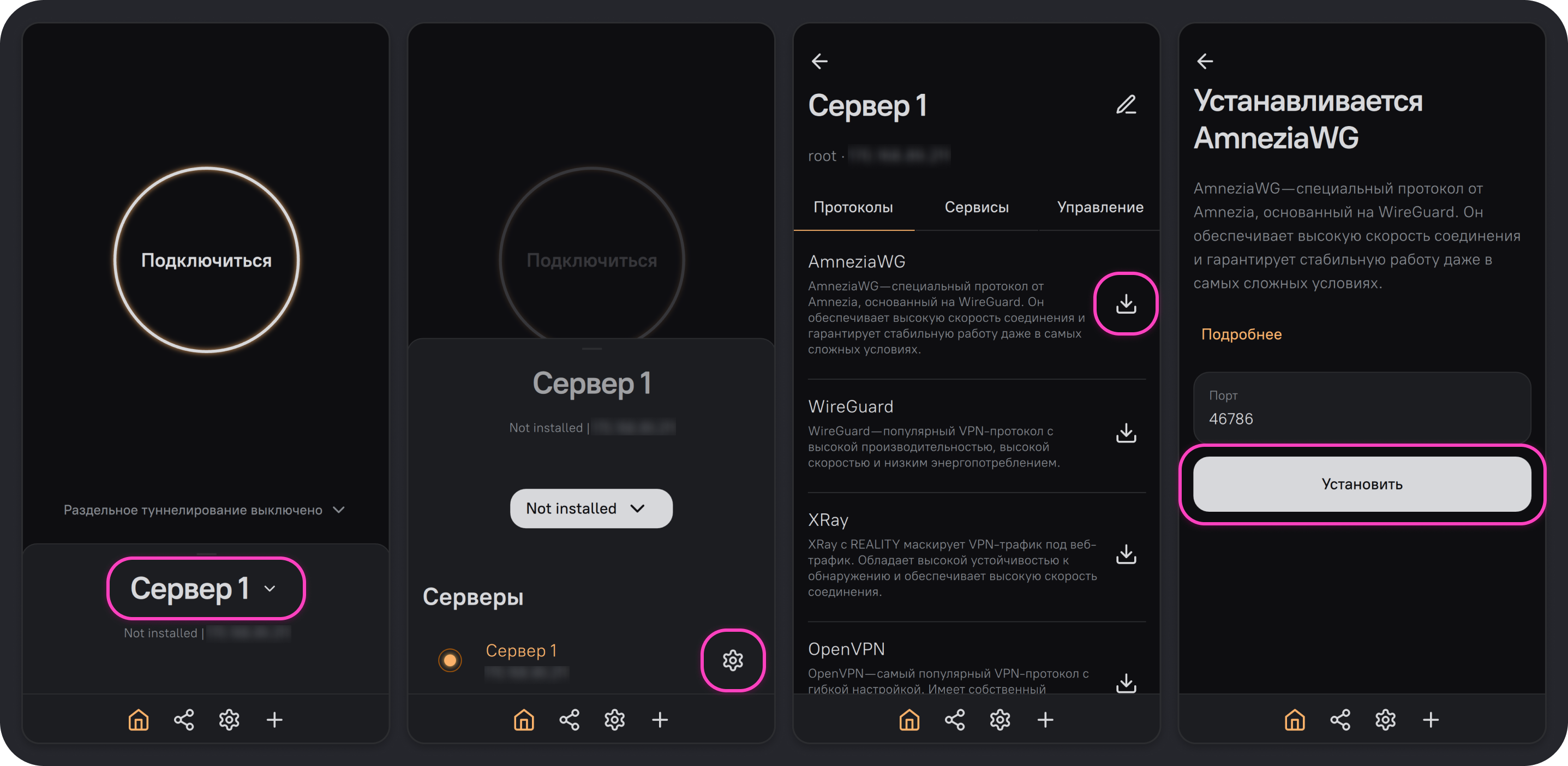 - Нажмите на иконку ⚙️ (шестерёнка) справа от подключения к вашему серверу — отобразится список всех протоколов, доступных для установки.