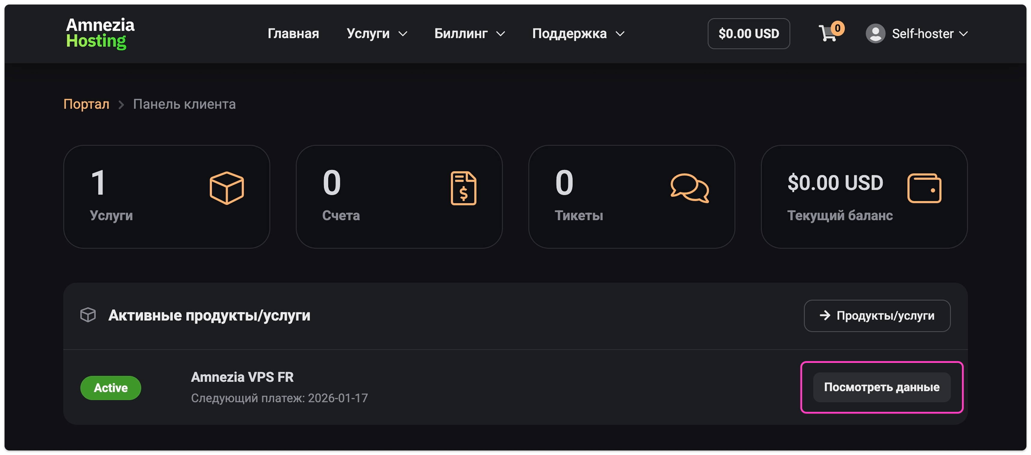 Данные для подключения к серверу можно найти в личном кабинете Amnezia Hosting (зеркало), для этого достаточно нажать Посмотреть данные справа от нужного сервера.