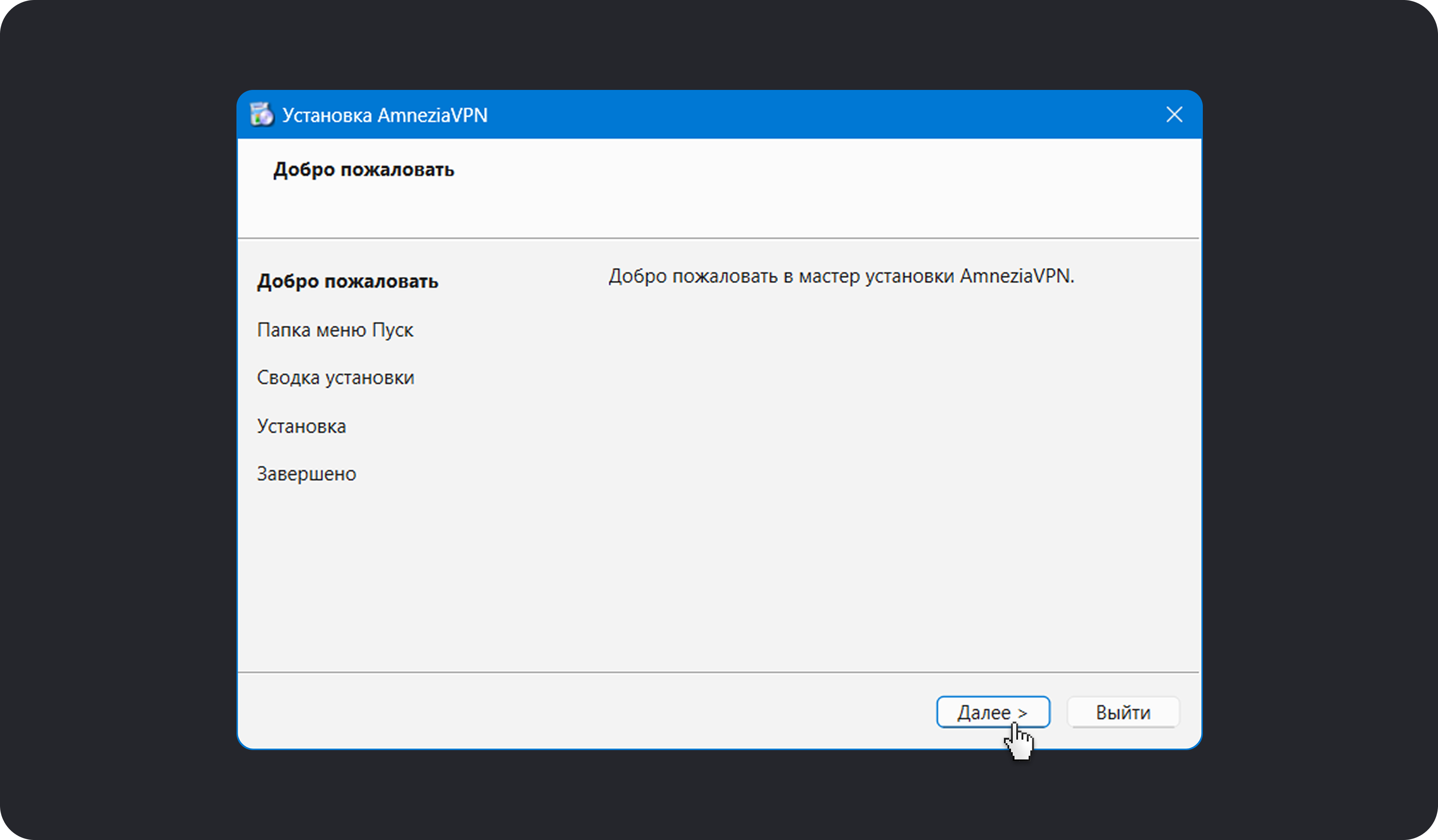 - После удаления AmneziaVPN откроется окно установки новой версии приложения. Нажмите Далее → Установить.