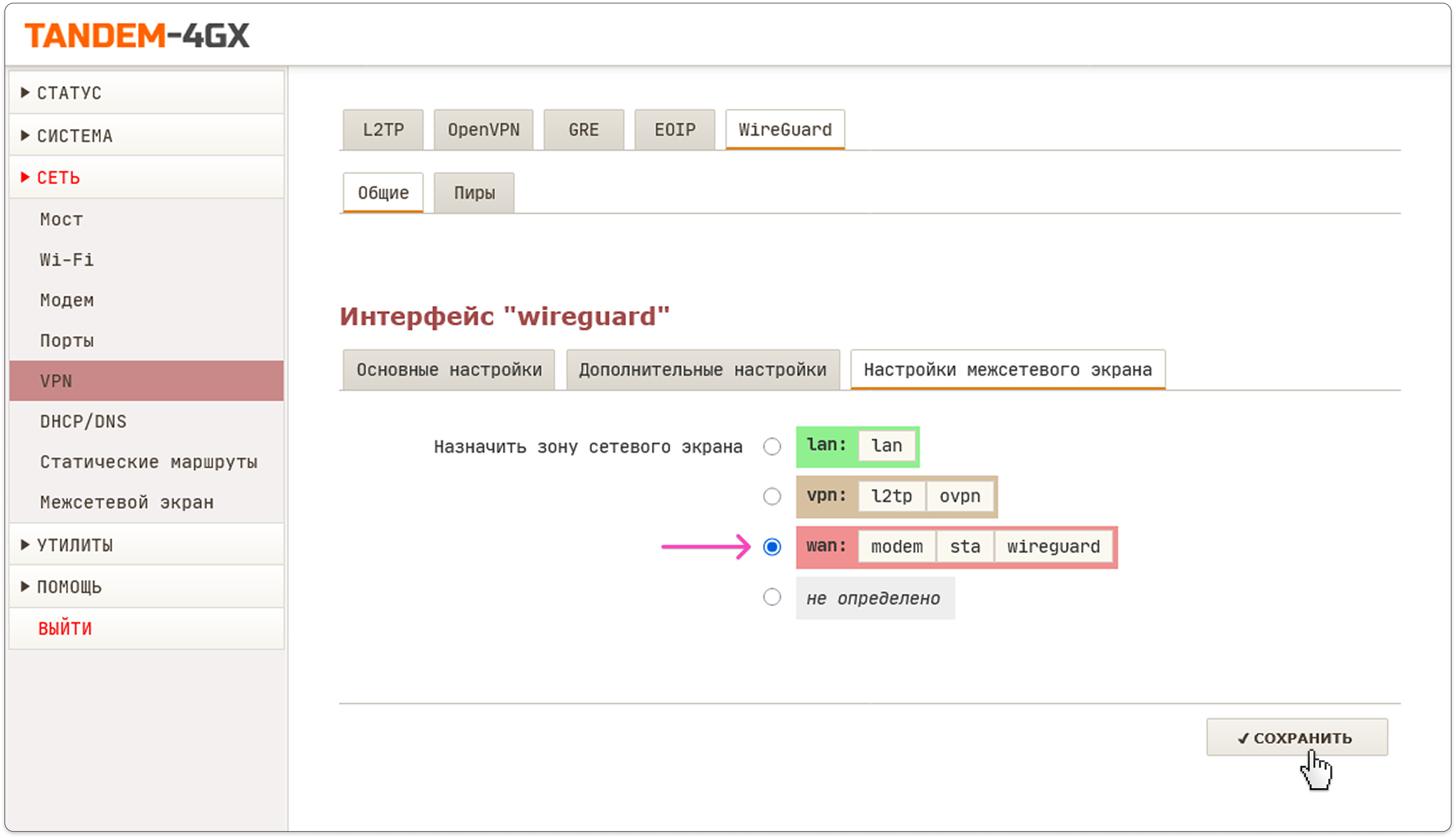 - На вкладке Настройки межсетевого экрана выберите зону WAN, чтобы активировать NAT, после чего нажмите кнопку Сохранить.