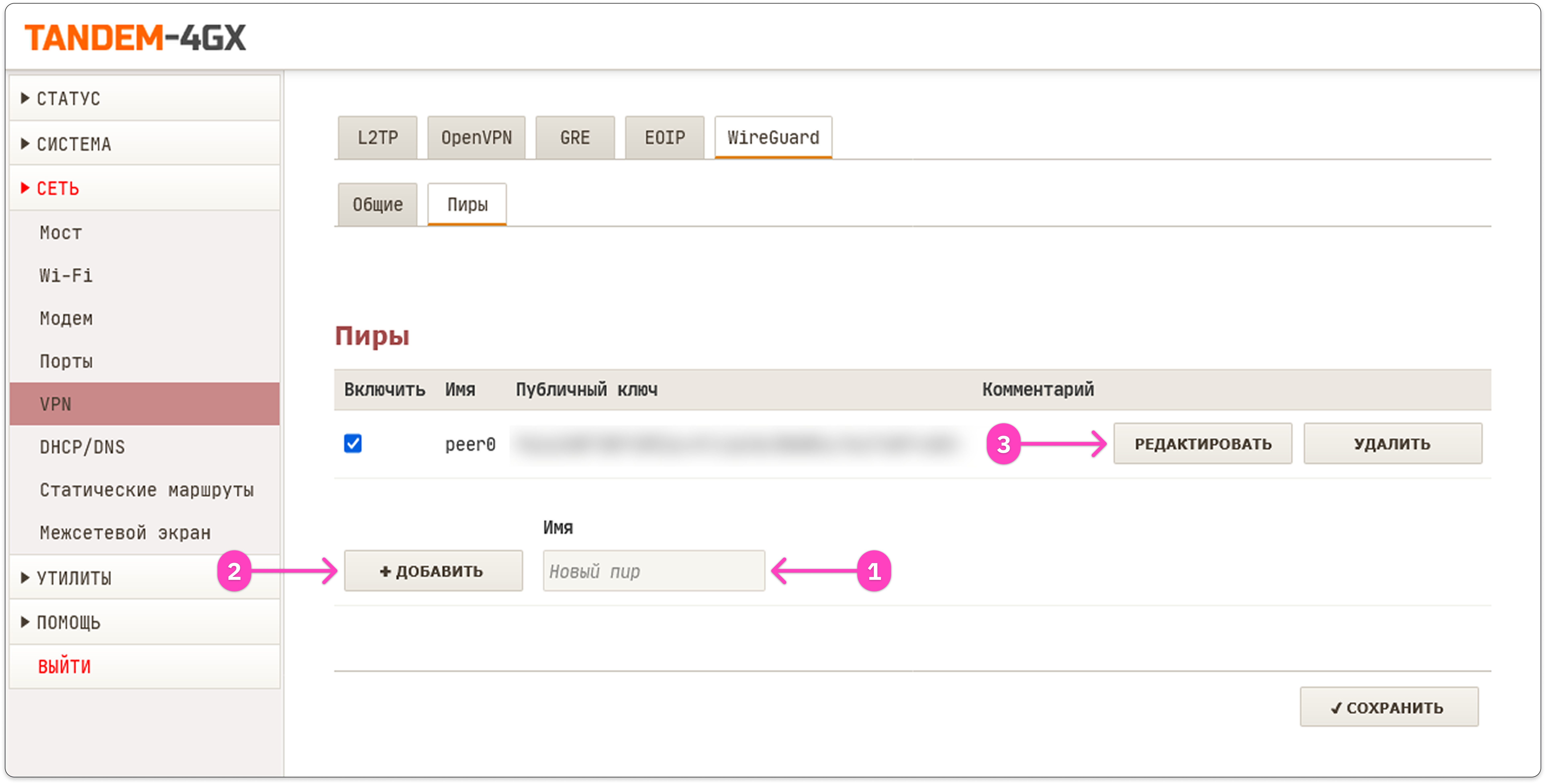 - Нажмите кнопку Редактировать справа от созданного пира, укажите все необходимые значения и нажмите кнопку Сохранить:
