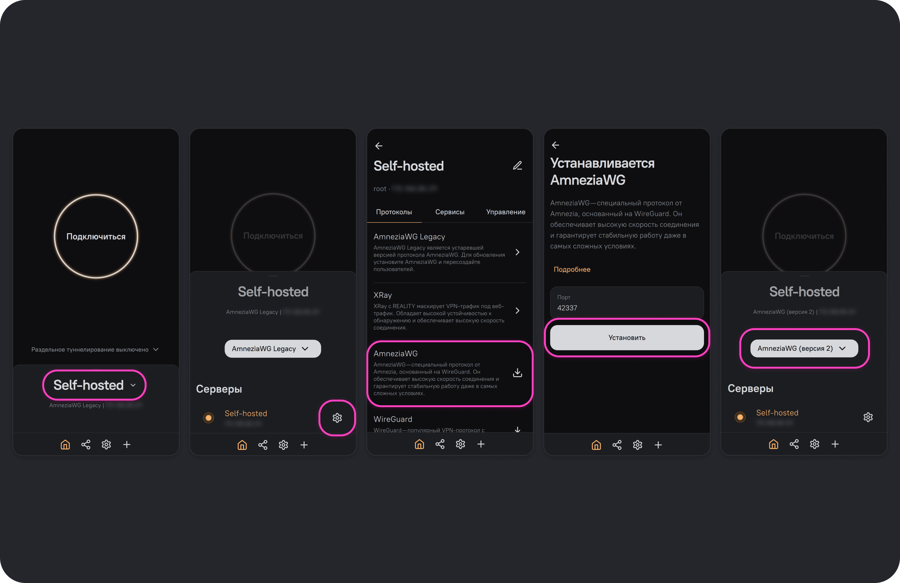В AmneziaVPN 4.8.12.7 и новее ранее установленный на сервере протокол AmneziaWG 1.0 будет отображаться как AmneziaWG Legacy — со своими файлами конфигурации и ключами для подключения, которые продолжат работать. При установке протокола AmneziaWG по умолчанию будет использоваться версия 2.0 — это другой, новый протокол, для подключения по которому потребуется сгенерировать новые гостевые конфигурации.