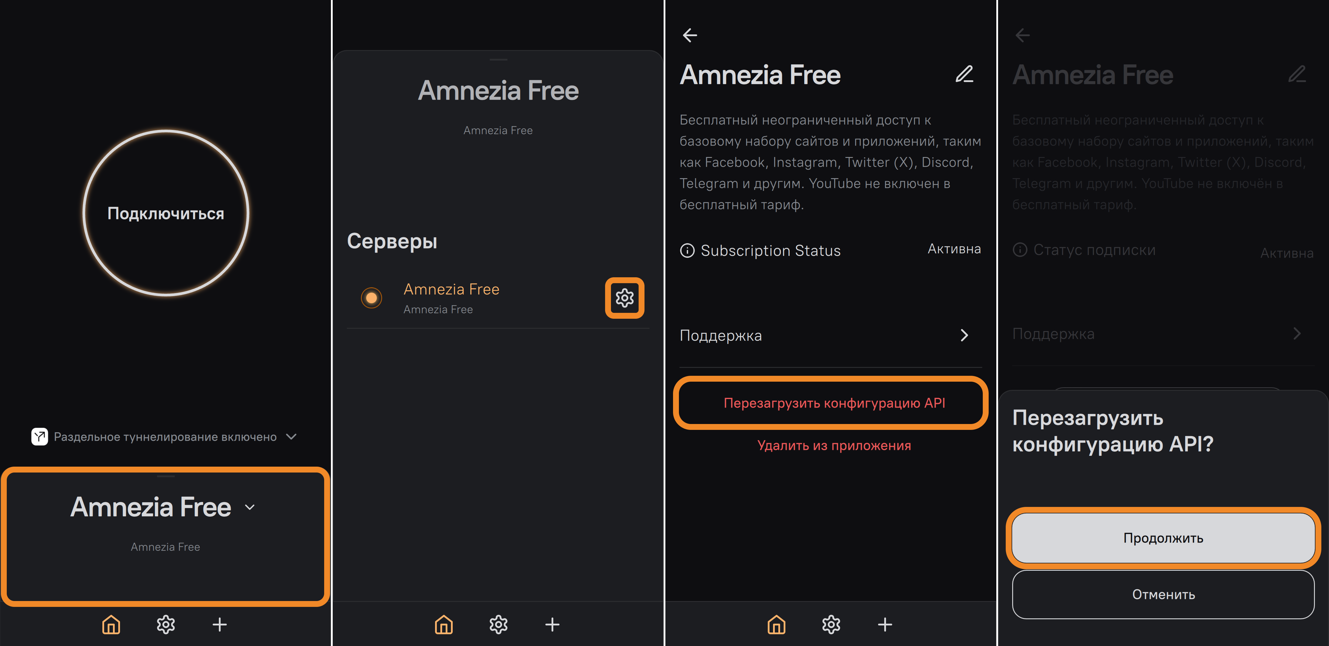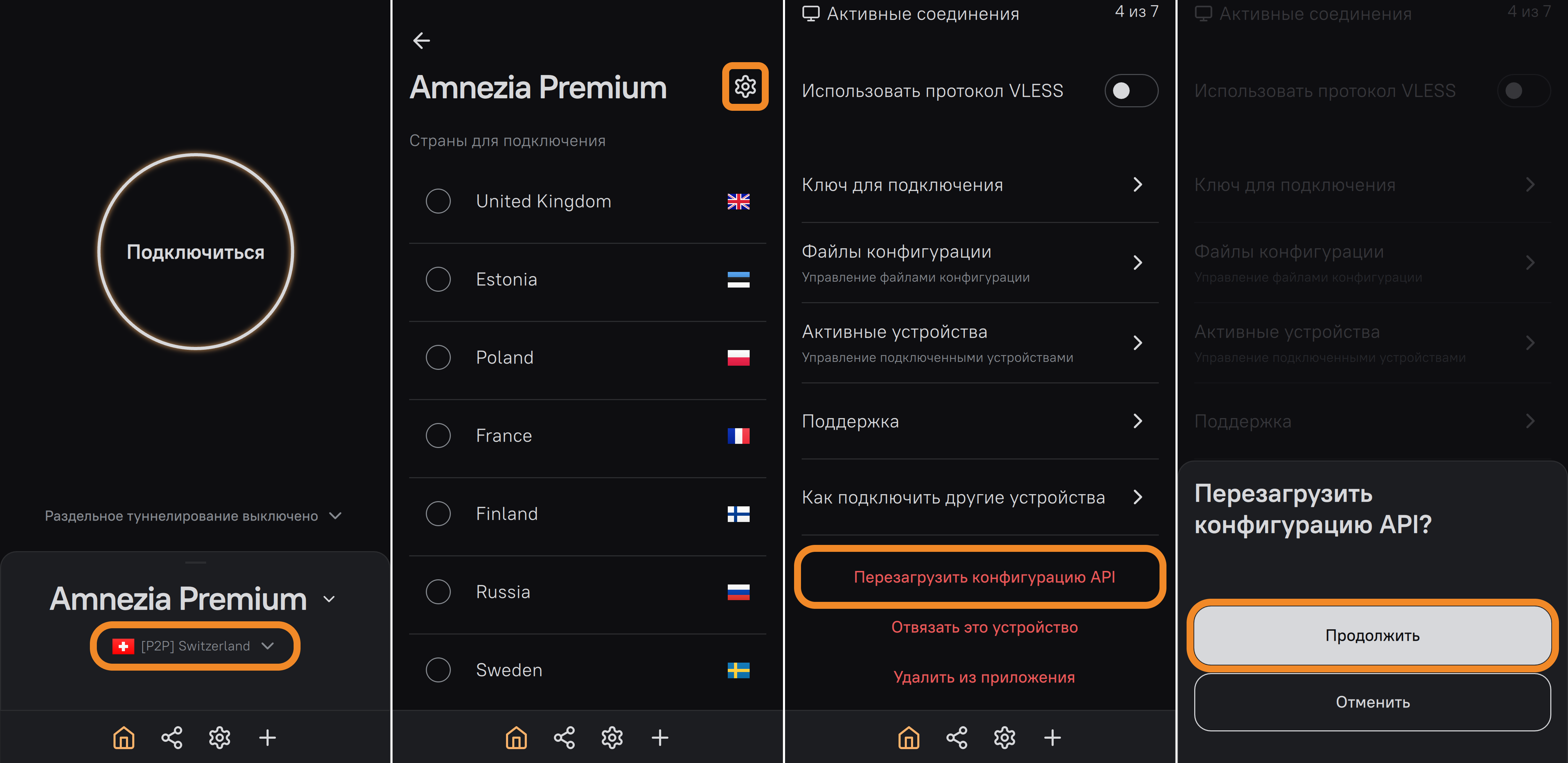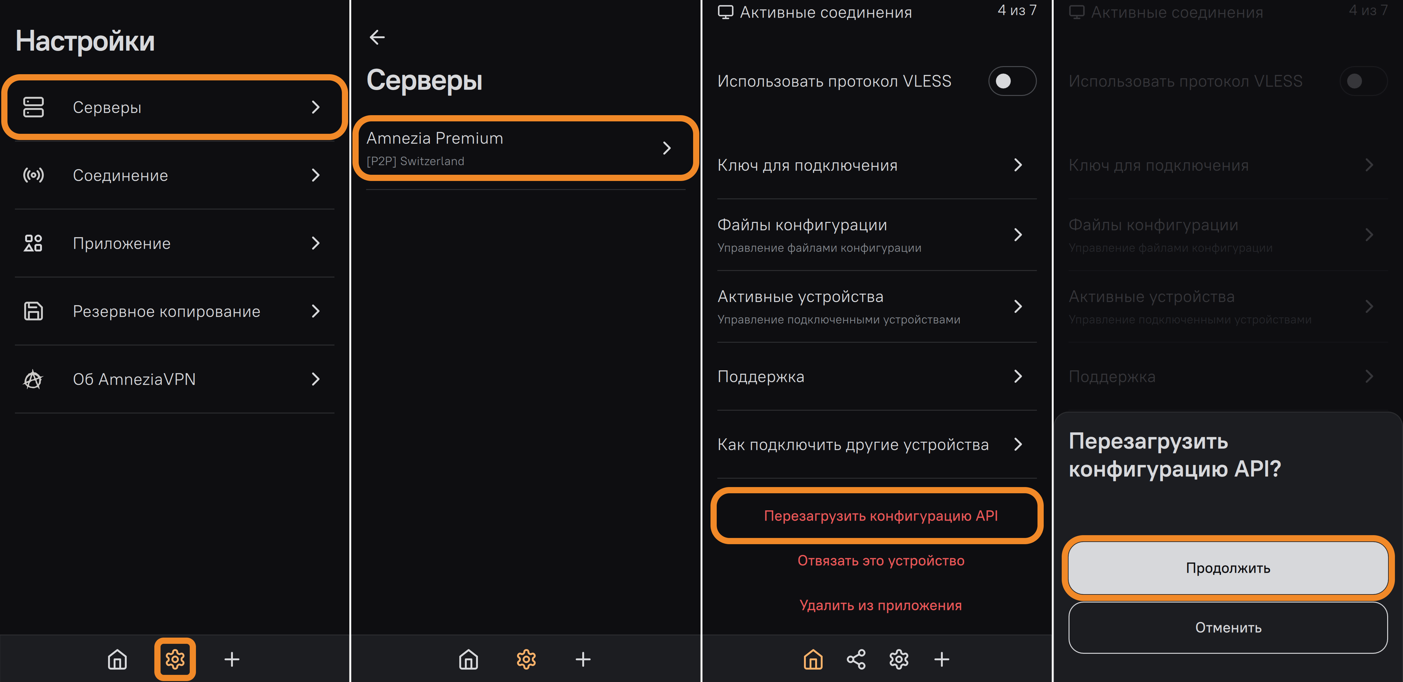 - В открывшемся разделе настроек сначала нажмите Перезагрузить конфигурацию API, затем Продолжить.