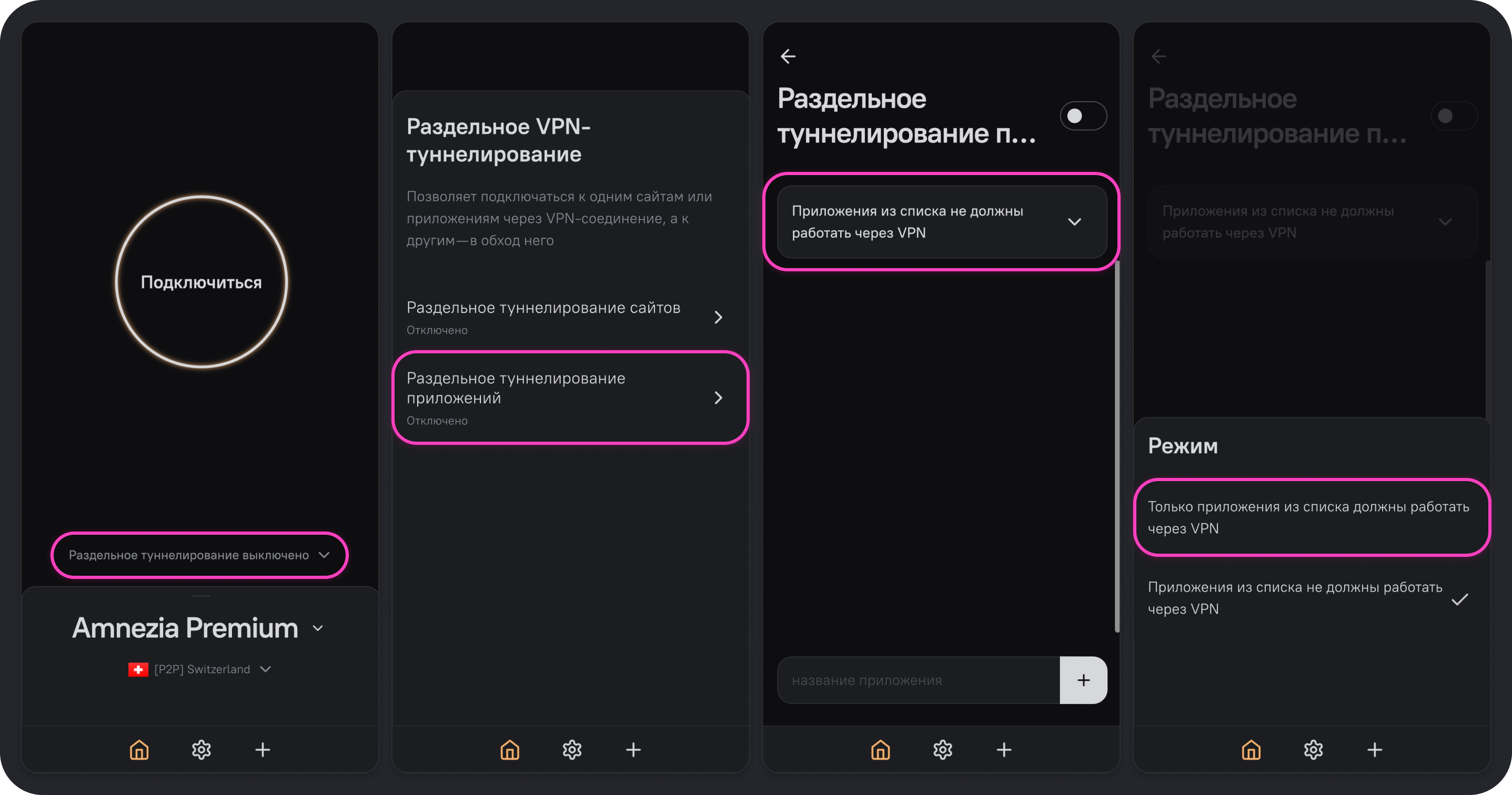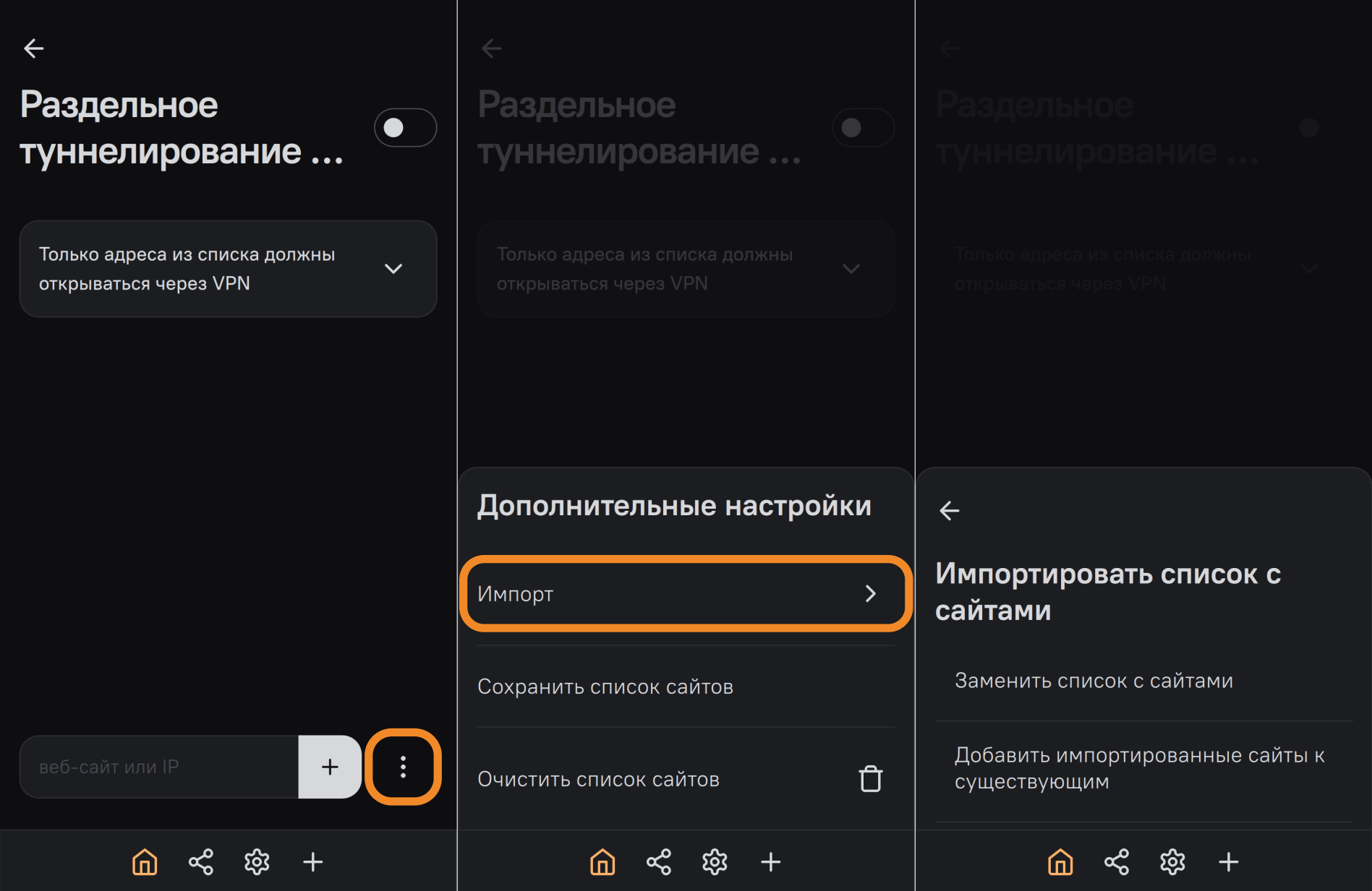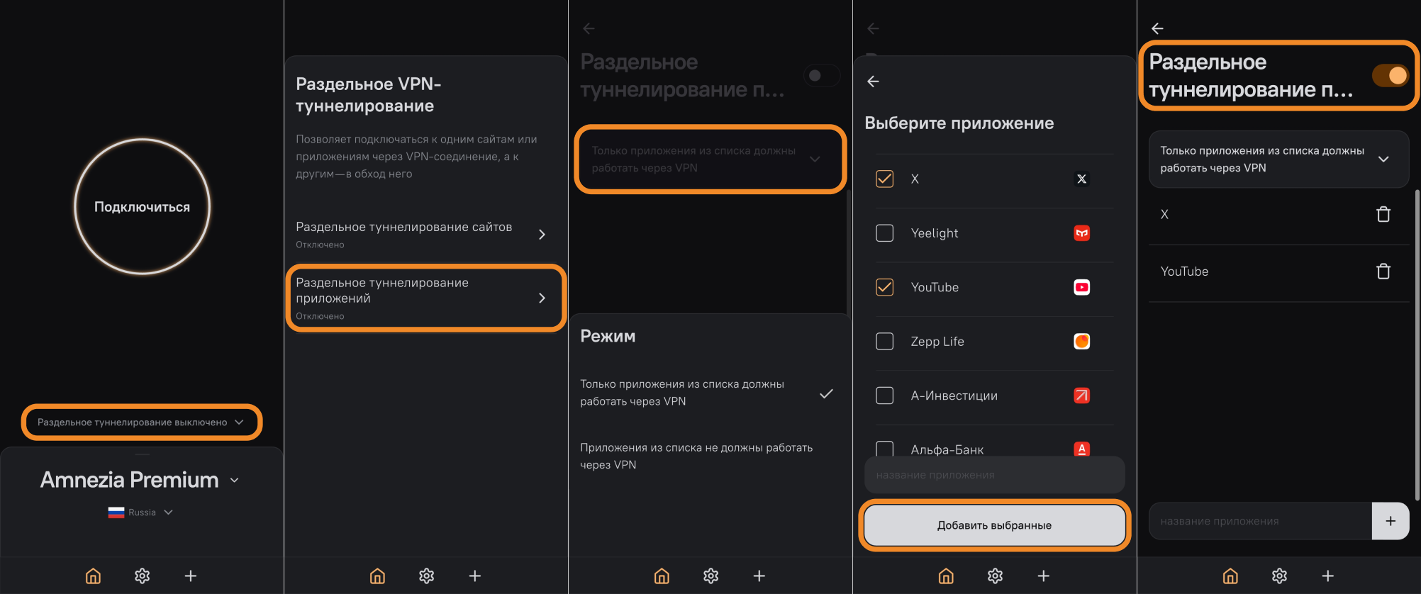 | Через VPN только IP-адреса из списка | Без VPN только IP-адреса из списка | Через VPN только приложения из списка | Без VPN только приложения из списка | |