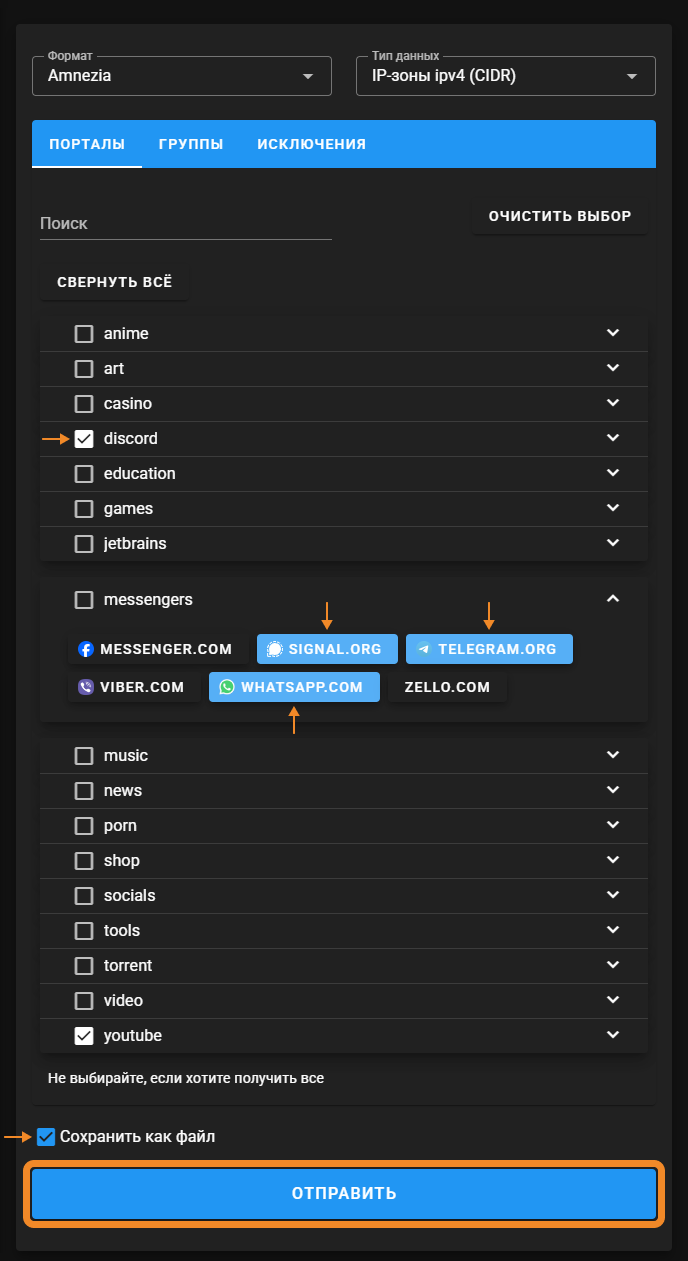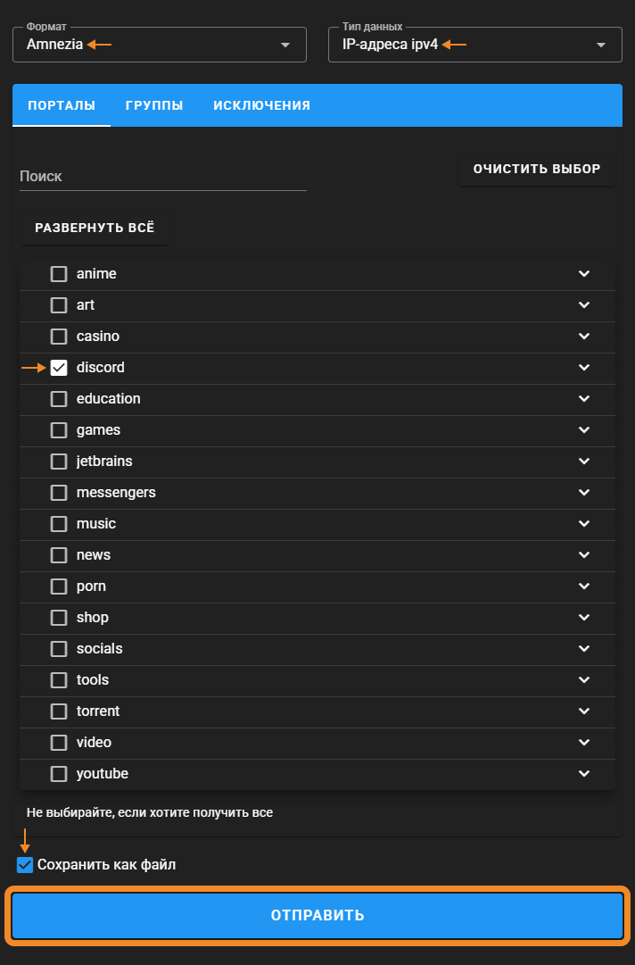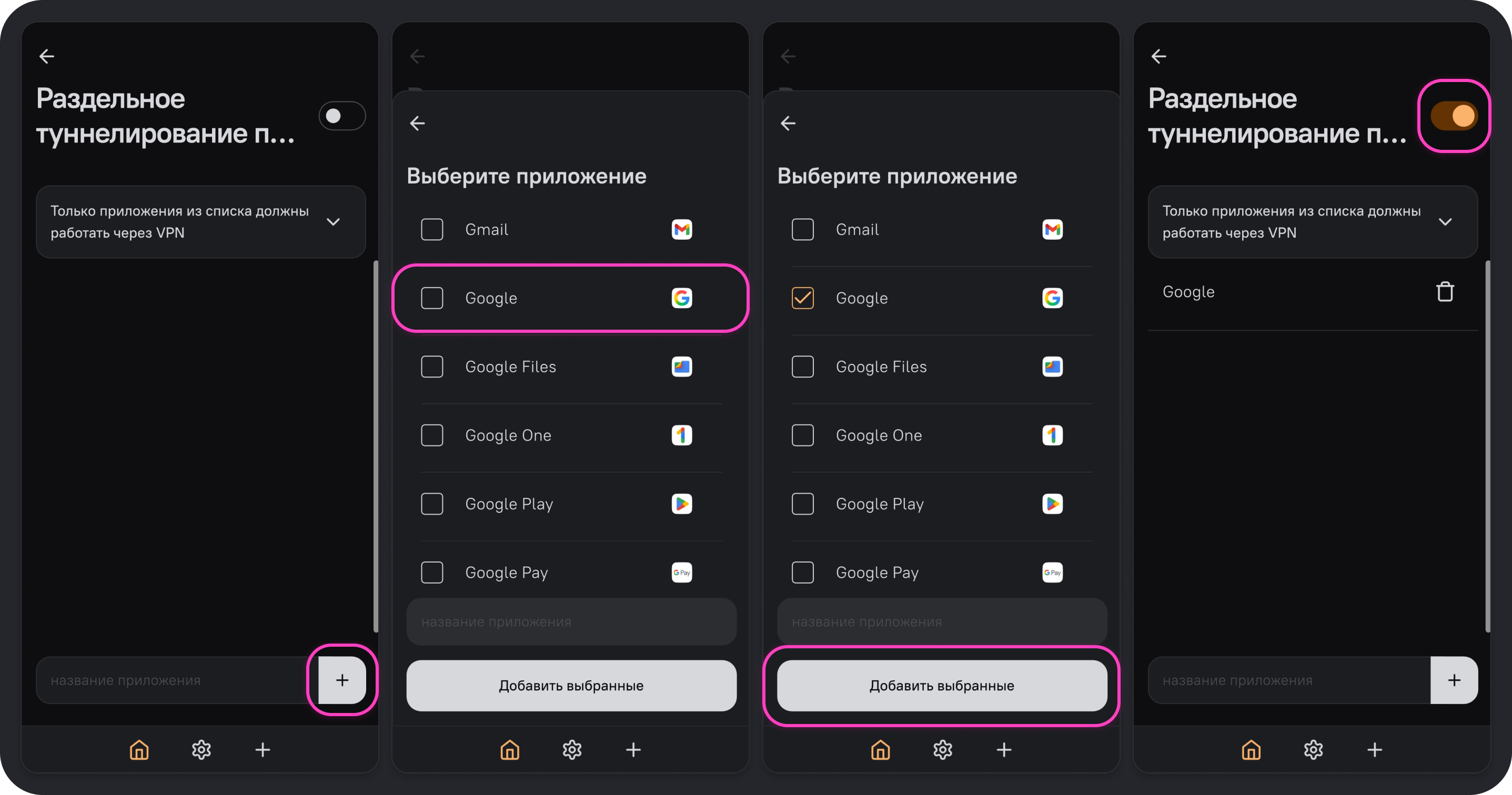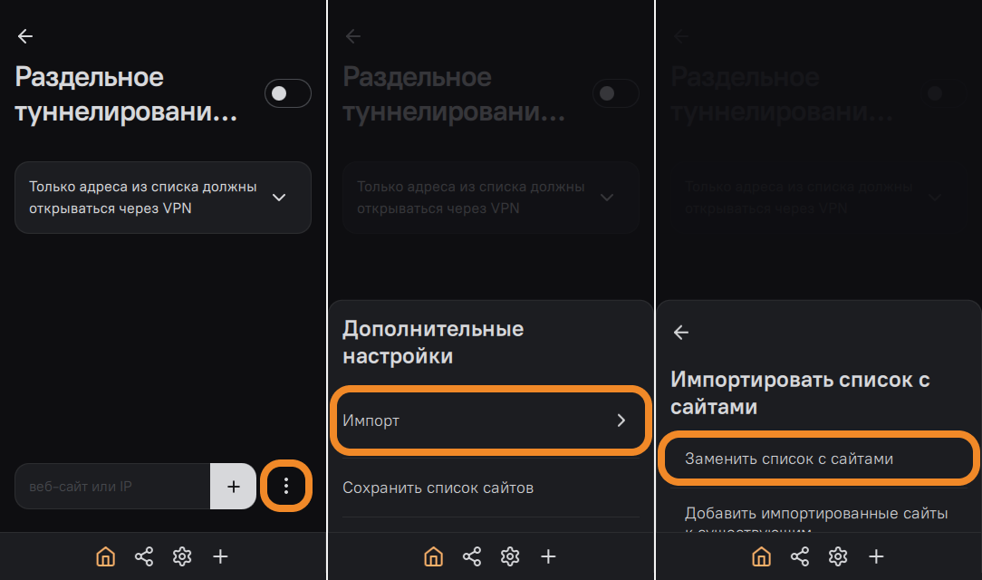 | Через VPN только IP-адреса из списка | Без VPN только IP-адреса из списка | Через VPN только приложения из списка | Без VPN только приложения из списка | |