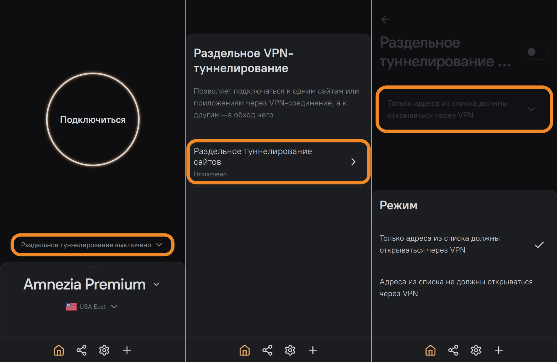 В зависимости от операционной системы в AmneziaVPN могут быть доступны как оба варианта раздельного туннелирования (и по IP-адресам, и по приложениям), так и только один — по IP-адресам/подсетям. Каждый из этих вариантов может иметь два режима — список IP-адресов/приложений открывается либо без VPN, либо через VPN.