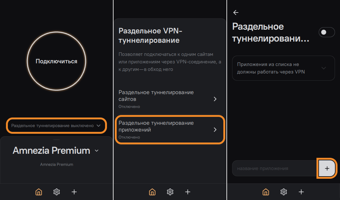 Раздельное туннелирование, или split tunneling — это функция приложения AmneziaVPN, позволяющая выбрать IP-адреса/подсети и приложения, которые будут работать через VPN или без VPN.