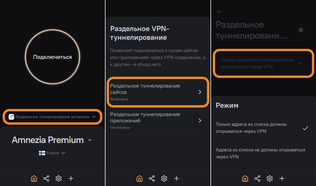 - Android — раздельное туннелирование можно настроить и по IP-адресам, и по приложениям, для каждого варианта доступны два режима: выбранные IP-адреса/приложения будут работать через VPN или без VPN.
