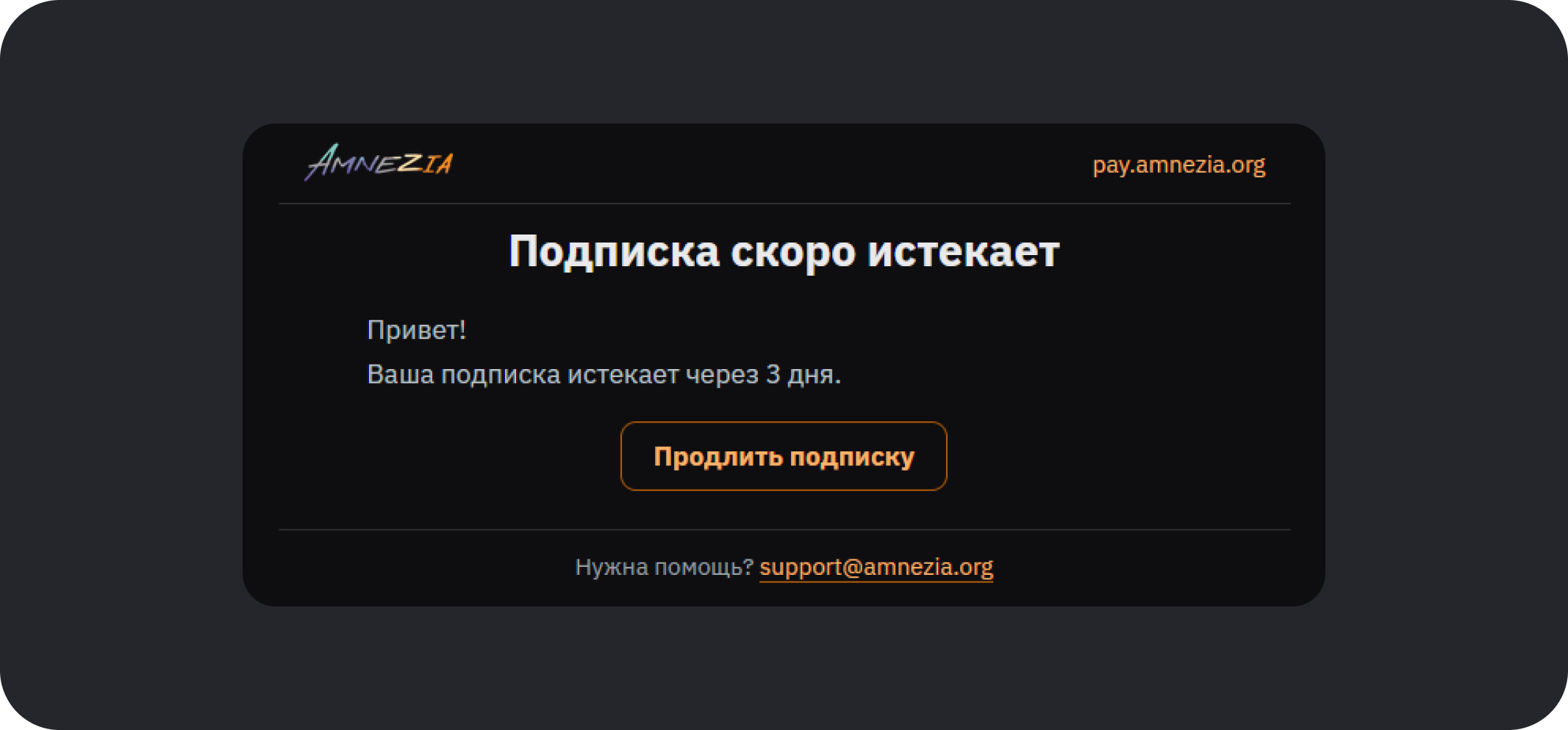 Вариант 1. Когда до окончания срока Amnezia Premium останется 3 дня, на вашу почту, указанную при оплате, придёт письмо с уведомлением об истечении подписки — в этом письме будет кнопка Продлить подписку. Нажмите её, выберите срок действия и метод оплаты, после чего оплатите продление Amnezia Premium.